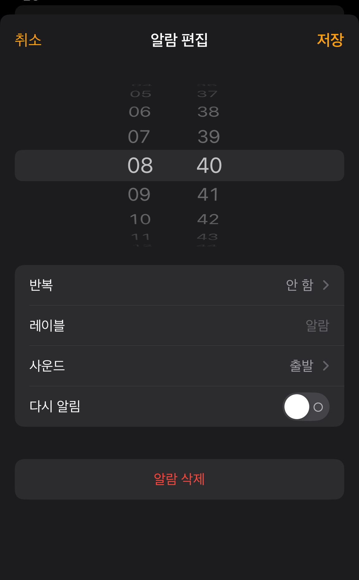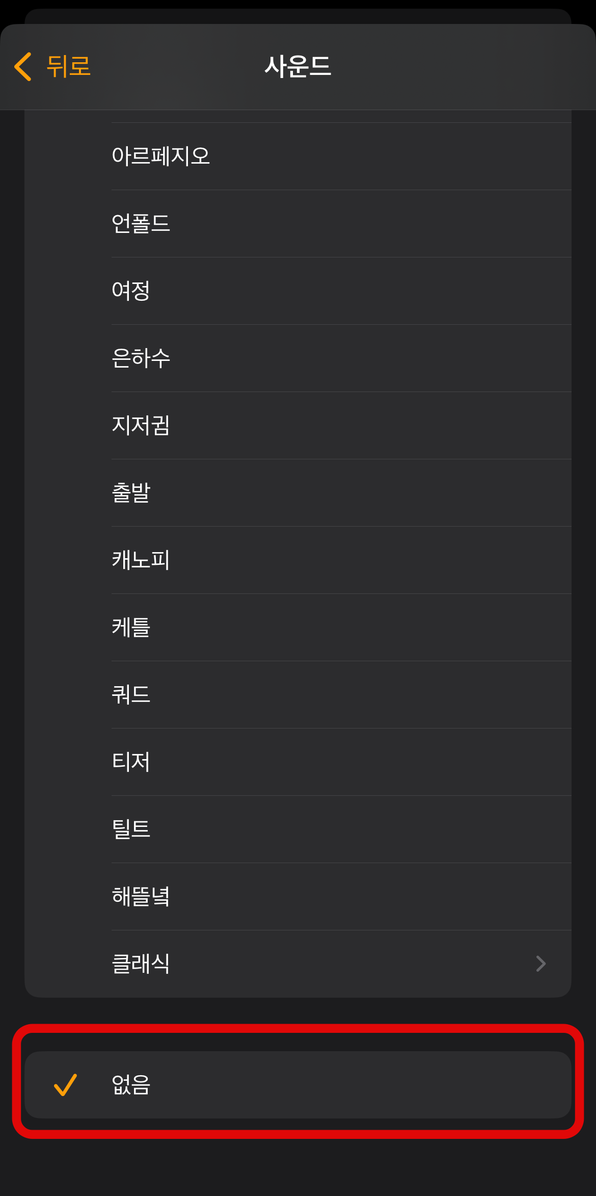 알람을 맞출 때 시간만 설정하고 바로 완료를 누르는 경우가 있는데 중간에 보이는 사운드로 들어가서 알람음이 설정되어 있는지 확인해야 한다. 혹시 없음으로 설정되어 있는 경우 알람 소리는 안 울리고 휴대폰만 밝아질 것이다. 아이폰 알람 오류 시 첫 번째로 확인을 해볼 사항이다.