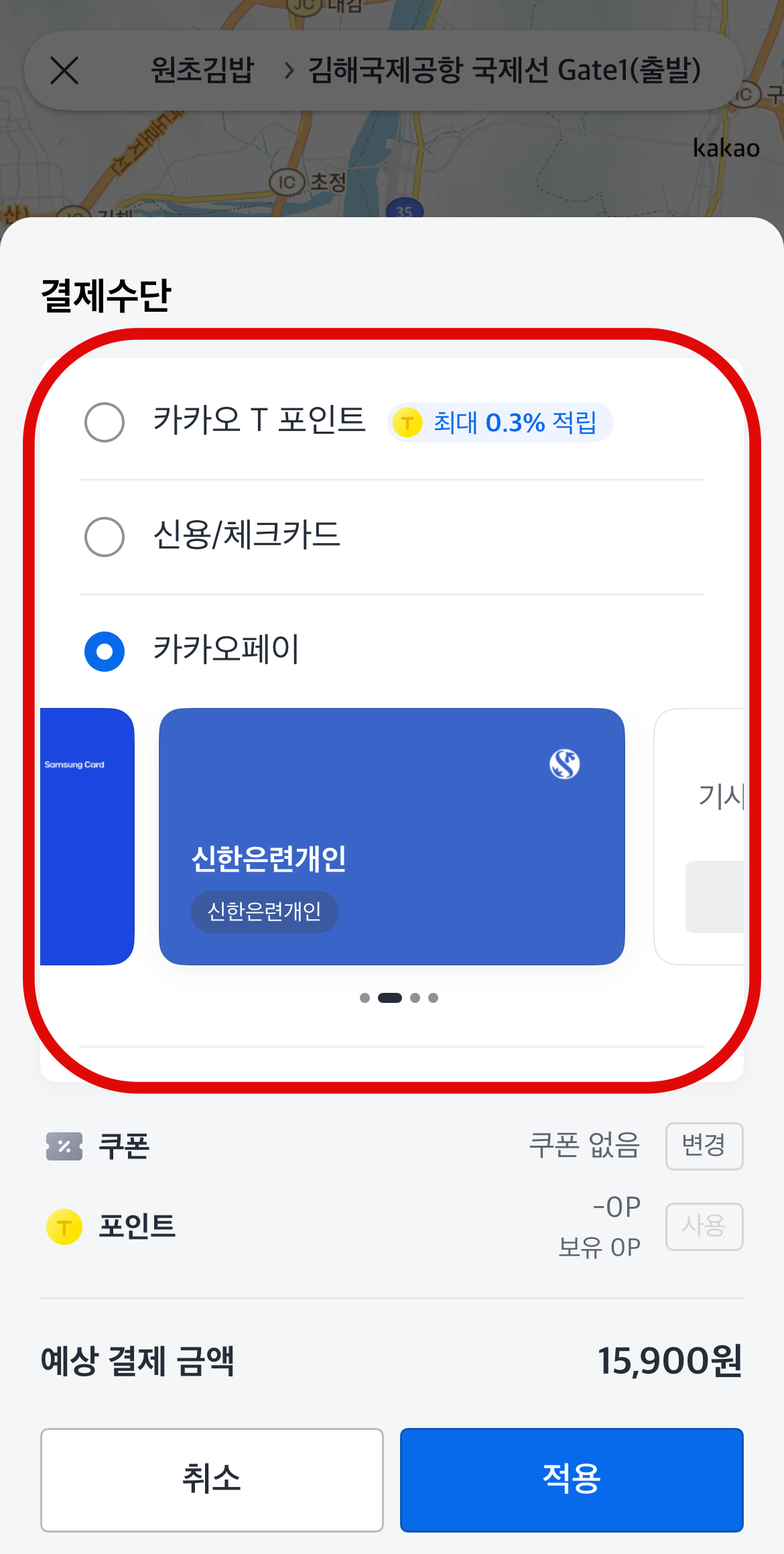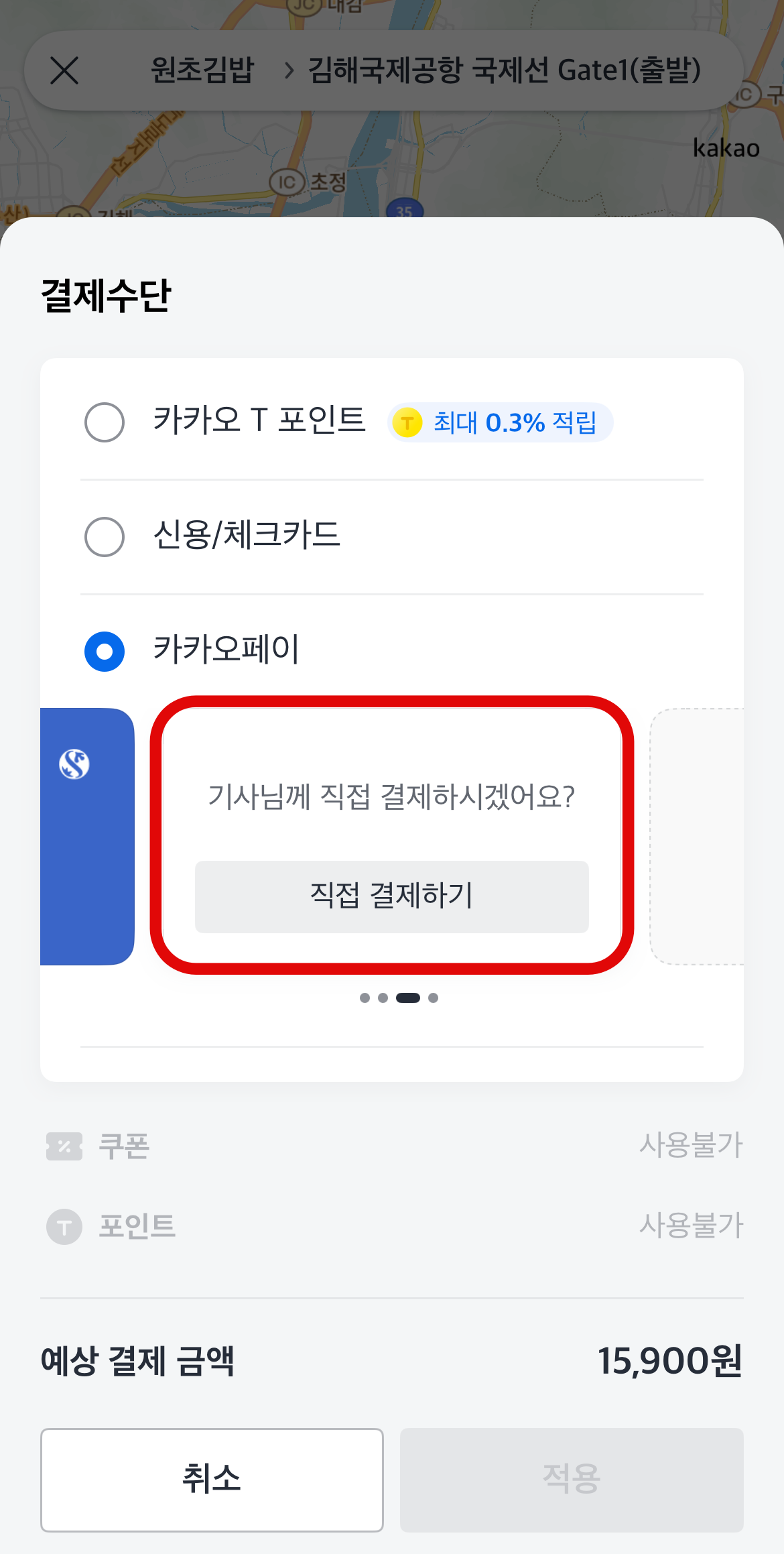 카카오택시 사용법 중 결제를 하는 방법은 카카오톡계정과 연동을 시켰다면 카카오톡에 저장된 카카오페이나 추가시켜 놓은 신용카드로 결제가 가능하다. 카카오계정과 연동을 시키지 않았다면 신용/체크카드를 눌러 카드를 추가시키거나 카카오페이에서 오른쪽으로 넘기다 보면 기사님께 직접 결제하기도 있으니 자신이 편한 방법으로 결제를 하면 될 것이다.