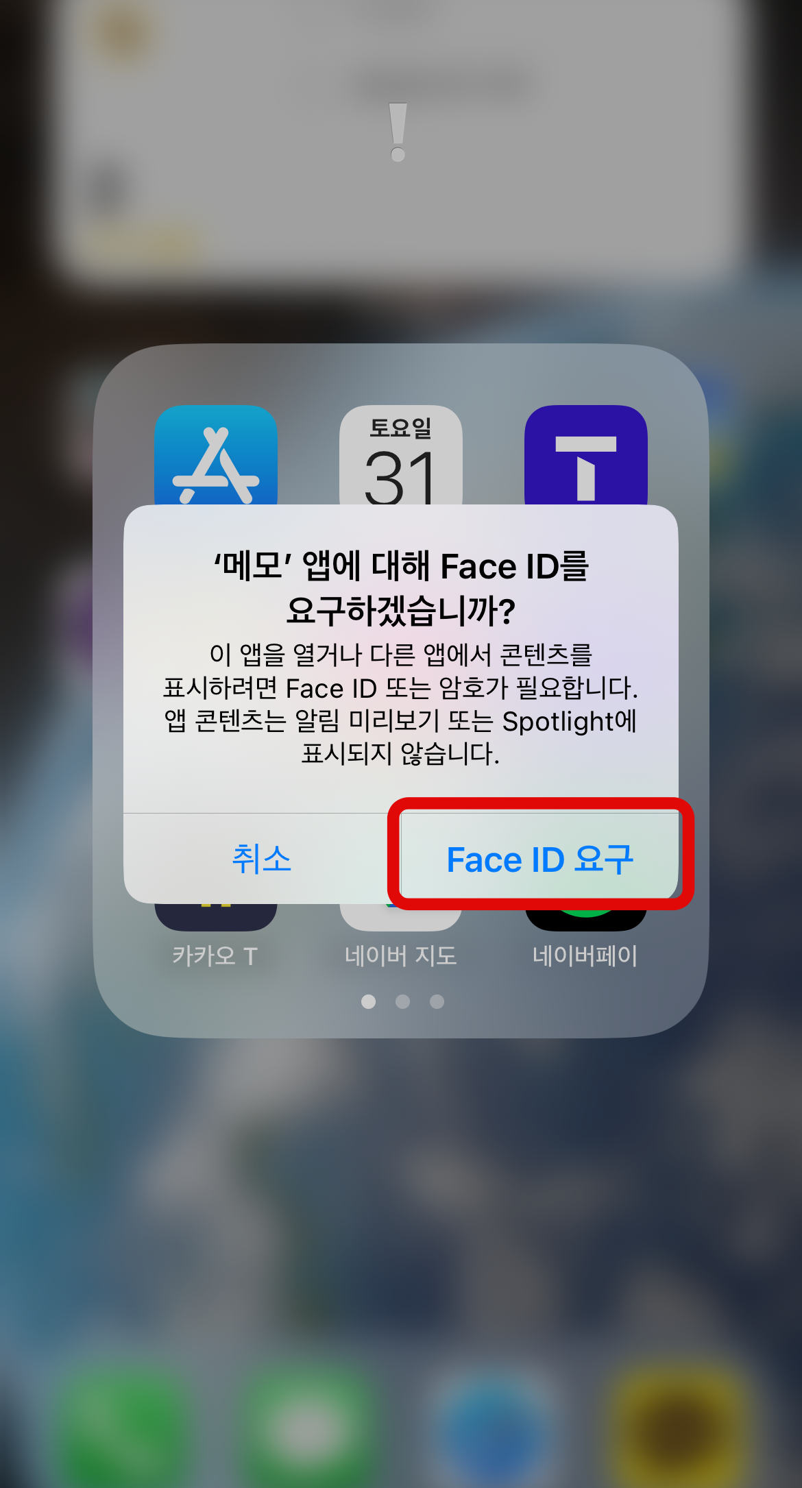 아이폰 메모 잠금 첫 번째 방법은 메모 어플을 전체적으로 잠그는 방법이다. 메모어플을 찾아 꾹 눌러보면 메모 어플에 대한 다양한 기능들이 나온다. 여기서 아래에 보이는 Face ID 요구를 눌러보자. 그러면 '메모 앱에 대하여 페이스아이디를 요구하겠습니까?'라는 문구와 함께 메모 앱을 잠글 수 있다. 그리고 메모를 눌러보면 얼굴인식이 되어야 메모가 열리는 것을 확인할 수 있을 것이다.