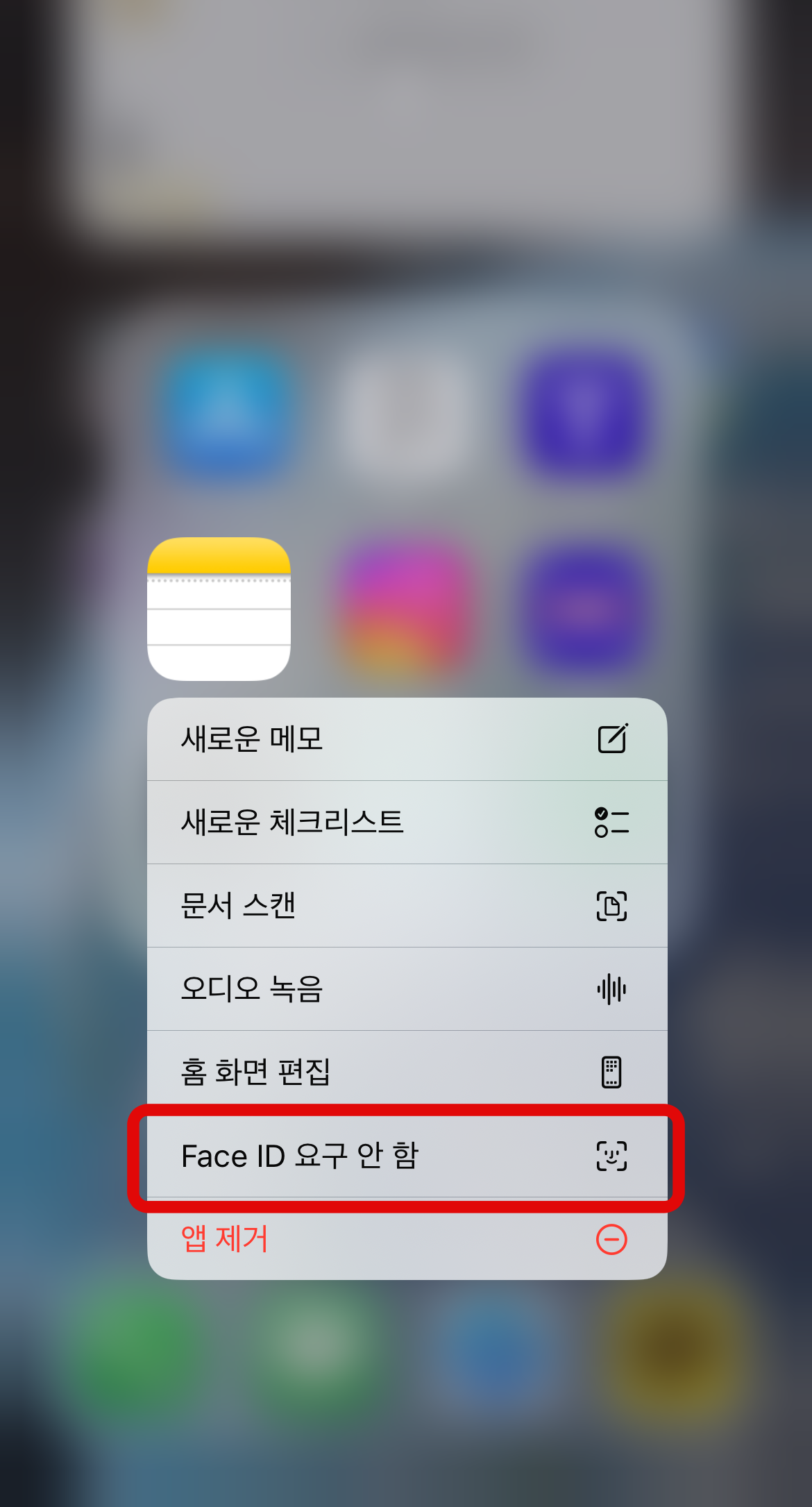아이폰 메모 잠금 첫 번째 방법은 메모 어플을 전체적으로 잠그는 방법이다. 메모어플을 찾아 꾹 눌러보면 메모 어플에 대한 다양한 기능들이 나온다. 여기서 아래에 보이는 Face ID 요구를 눌러보자. 그러면 '메모 앱에 대하여 페이스아이디를 요구하겠습니까?'라는 문구와 함께 메모 앱을 잠글 수 있다. 그리고 메모를 눌러보면 얼굴인식이 되어야 메모가 열리는 것을 확인할 수 있을 것이다.