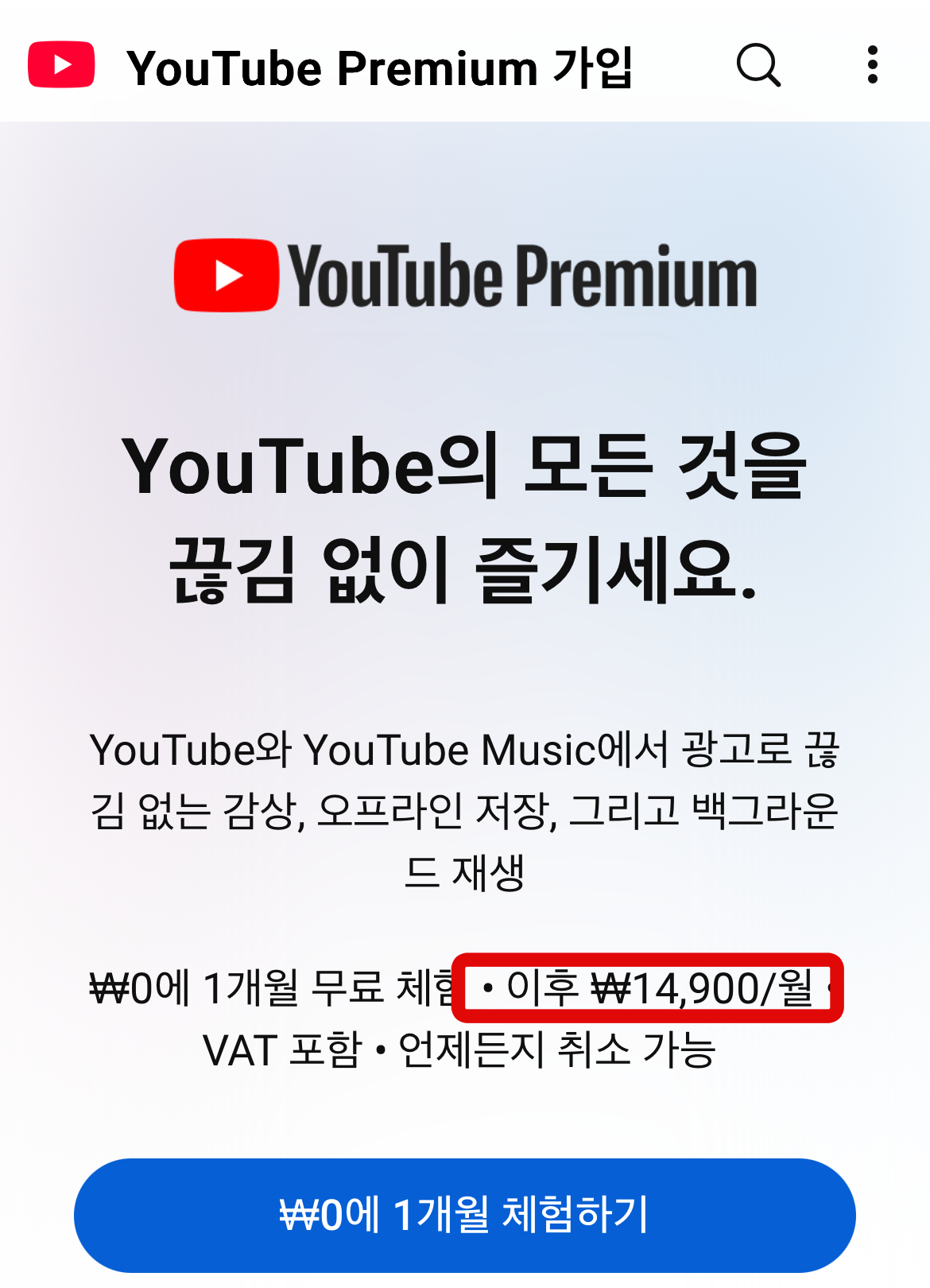 아이폰으로 그냥 유튜브에 들어가서 하면 19,500원이고 사파리를 통하여 가입을 하면 14,900원이니 한 끗차이인데 매달 4,000원을 절약할 수 있는 것이다. 물론 이러한 방법으로 가입을 하더라도 아이폰으로 유튜브 프리미엄 혜택을 모두 즐길 수 있으니 걱정하지 않아도 된다. 혹시 이 방법을 몰랐어서 그냥 결제를 했던 사람이라면 취소를 하고 다시 PC로 가입을 하는 것을 추천한다.
