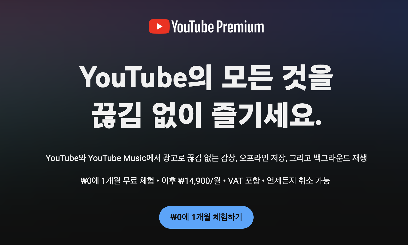 유튜브 프리미엄에 가입을 하게 되면 매달 정기적으로 요금이 발생하며 유튜브를 시청할 때 광고 없이 시청을 할 수 있다. 그리고 오프라인 저장과 백그라운드 재생까지 가능하여 장거리 출장을 많이 다니는 사람이라면 동영상을 집에서 저장을 해두었다가 데이터 필요 없이 영상 시청이 가능하다. 그리고 앞서 말했듯이 유튜브 뮤직과 연결이 되어 수많은 음악을 들을 수 있다.