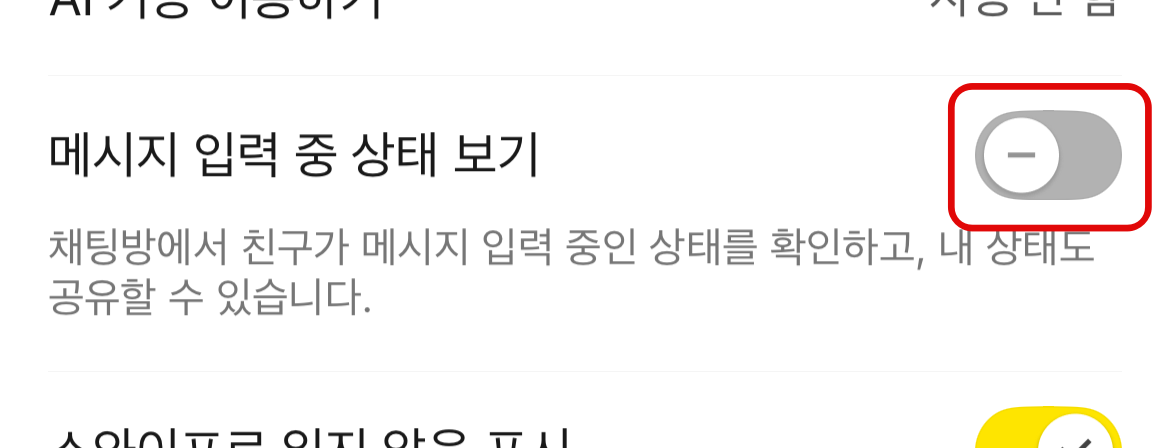 이렇게 메시지 입력 중 상태 보기를 비활성화하면 카톡 입력중 표시 끄기가 된다. 채팅방에서 친구가 입력중인 메시지를 보는 것과 내 상태를 공유하는 것을 모두 끌 수 있으니 이 기능으로 한 번에 해결할 수 있다.