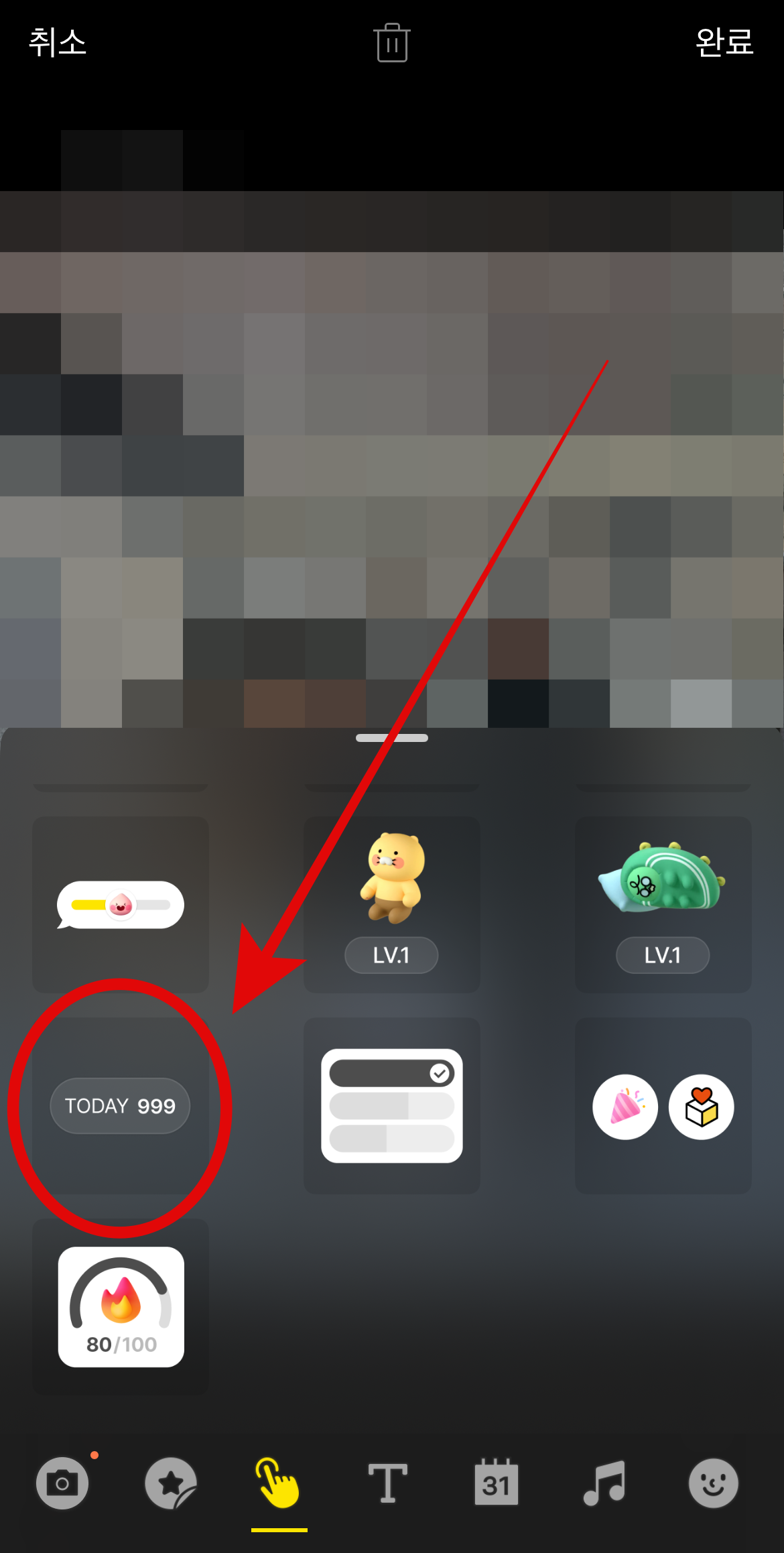 카카오 뮤직이나 이모티콘으로 카톡 투데이 방문자 숨기기를 하고 싶지 않다면 누끼 따기를 통하여 배경화면에 자신이 찍은 사진을 추가할 수도 있다. 이 외에도 텍스트, 스티커를 통하여 가리거나 디데이를 만들어 가려도 된다.