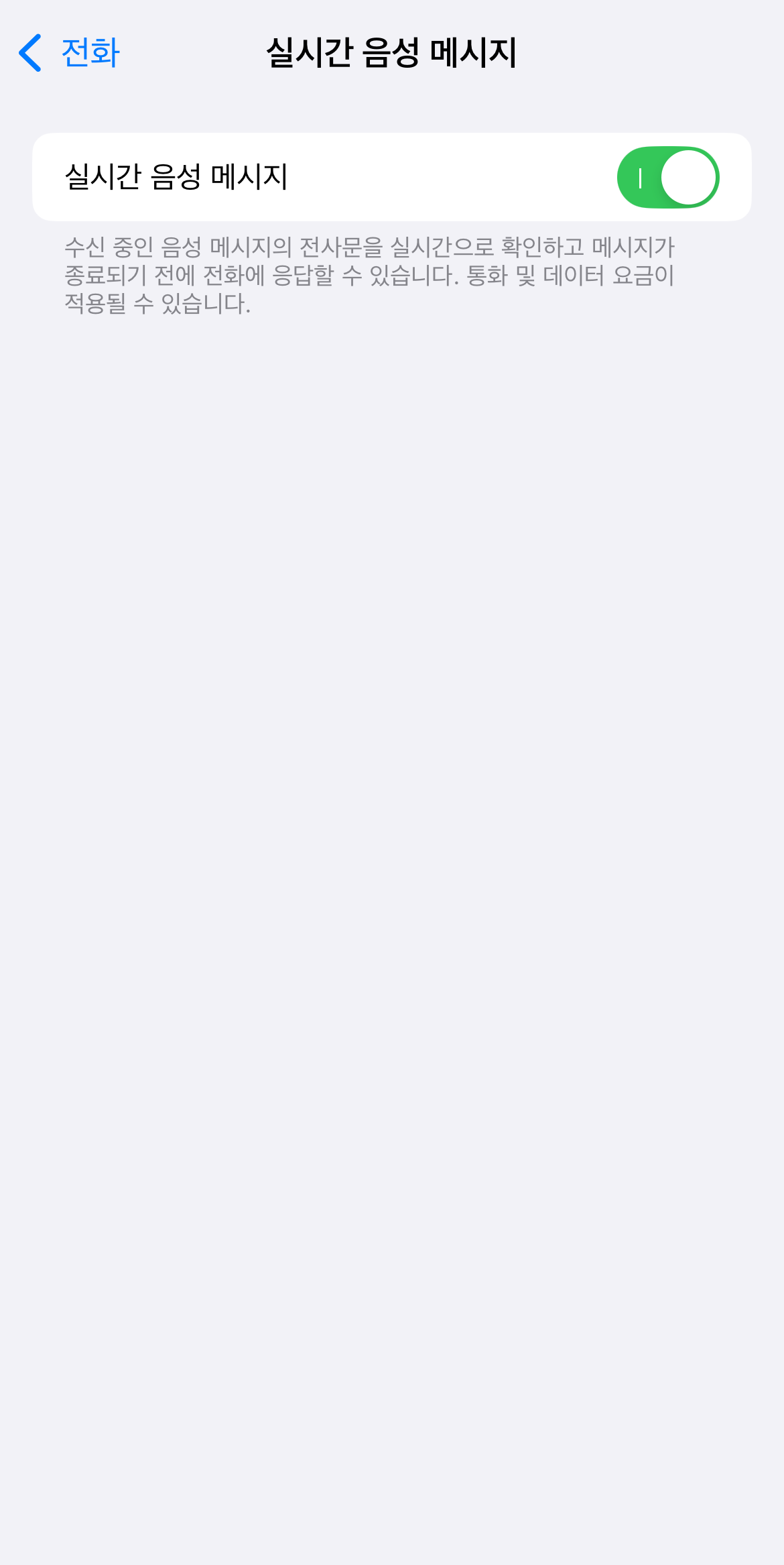 실시간 음성 메시지로 들어오면 활성화되어 있는 것을 볼 수 있다. 실시간 음성 메시지 버튼을 눌러 비활성화시켜 주면 아이폰 음성사서함 끄기가 될 것이다. 음성사서함 기능을 쓰지 않아도 카카오톡이나 다른 메신저를 통하여 메시지를 남길 수 있으니 딱히 필요한 기능은 아니라고 생각한다. 나중에 이 기능을 다시 켜고 싶다면 똑같이 들어와서 실시간 음성 메시지를 활성화시켜 주면 언제든지 다시 이용할 수 있다.