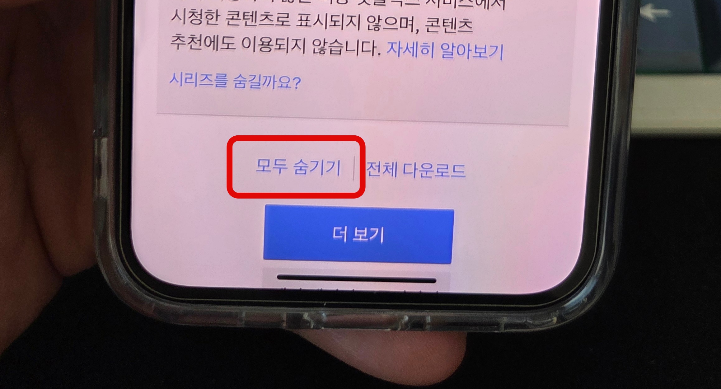 이렇게 하나씩 삭제를 하지 않고 모든 넷플릭스 시청기록 삭제를 하고 싶다면 아래에 보이는 모두 숨기기를 누르면 된다. 모두 숨기기를 누르면 전체 시청기록을 삭제할 수 있다.