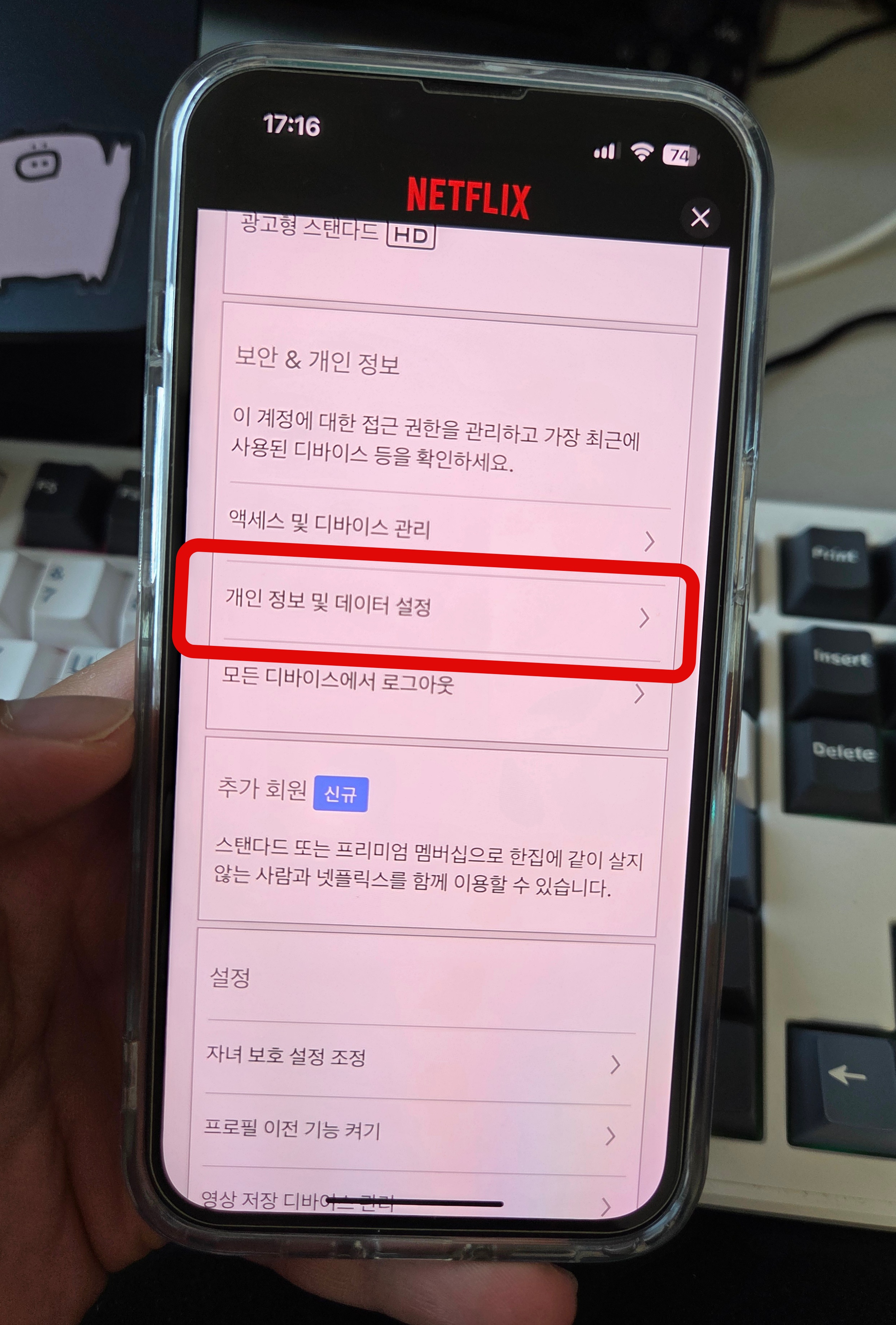 계정으로 들어오면 이 계정에 관련된 설정을 할 수 있다. 여기서 넷플릭스 시청기록 삭제를 하기 위해서는 스크롤을 조금 내려 개인 정보 및 데이터 설정으로 들어가자. 그러면 바로 시청 기록이라는 카테고리를 볼 수 있을 것이다. 시청 기록을 누른다.