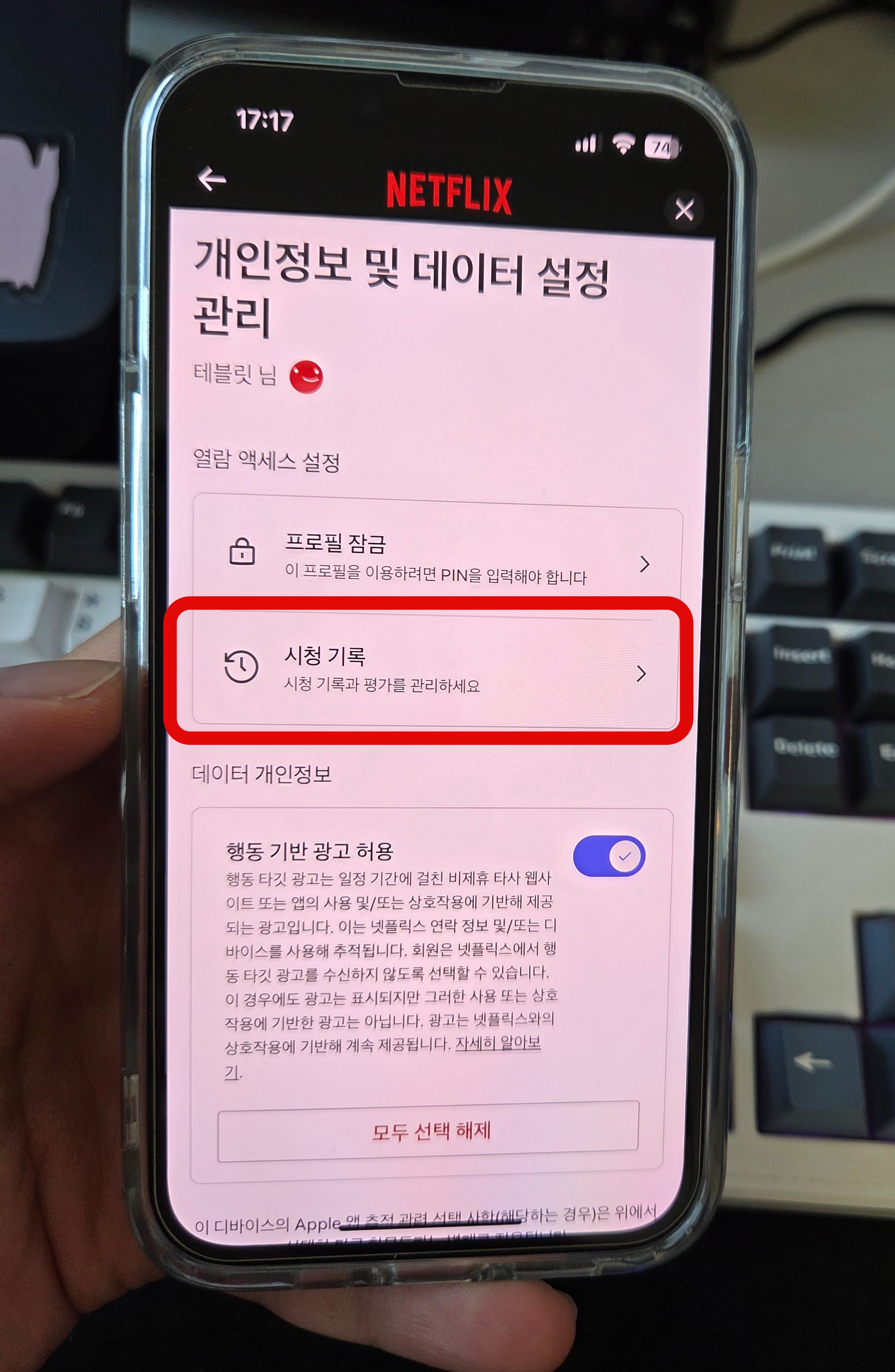 계정으로 들어오면 이 계정에 관련된 설정을 할 수 있다. 여기서 넷플릭스 시청기록 삭제를 하기 위해서는 스크롤을 조금 내려 개인 정보 및 데이터 설정으로 들어가자. 그러면 바로 시청 기록이라는 카테고리를 볼 수 있을 것이다. 시청 기록을 누른다.