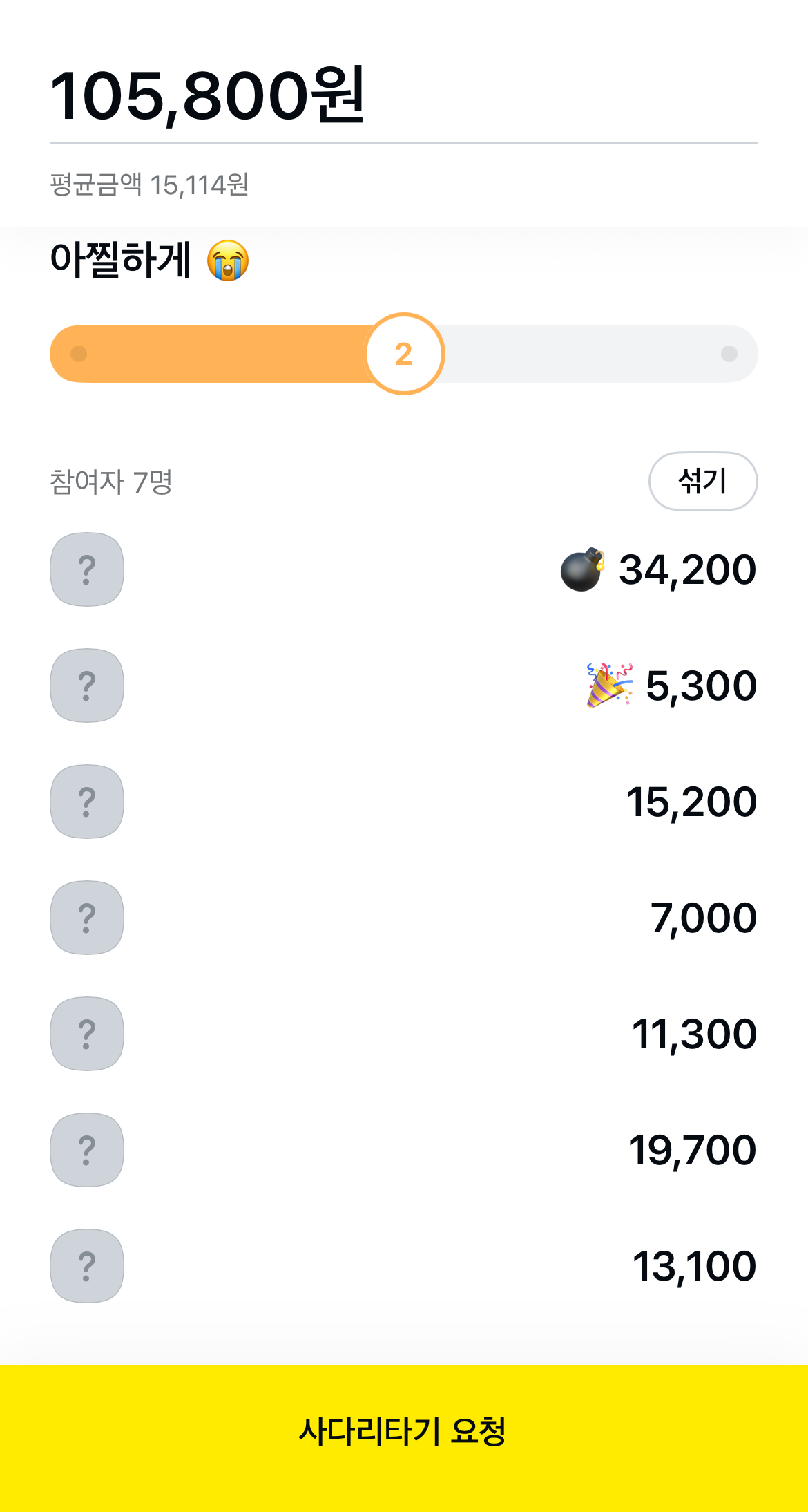 약간의 도파민을 맛보고 싶다면 1/N 정산하기 아래에 있는 정산 사다리타기를 눌러보자. 정산 사다리타기로 들어 왔다면 인원을 설정하고 적당히, 아찔하게, 무자비하게 중 하나를 선택하면 랜덤으로 금액이 정해진다. 금액이 마음에 들지 않는다면 섞기를 눌러 금액을 바꿀 수 있다. 원하는 금액분배가 끝나면 아래에 사다리타기 요청을 누르면 각자의 금액을 송금하라는 문구와 함께 카톡 사다리타기 결과를 확인할 수 있다.