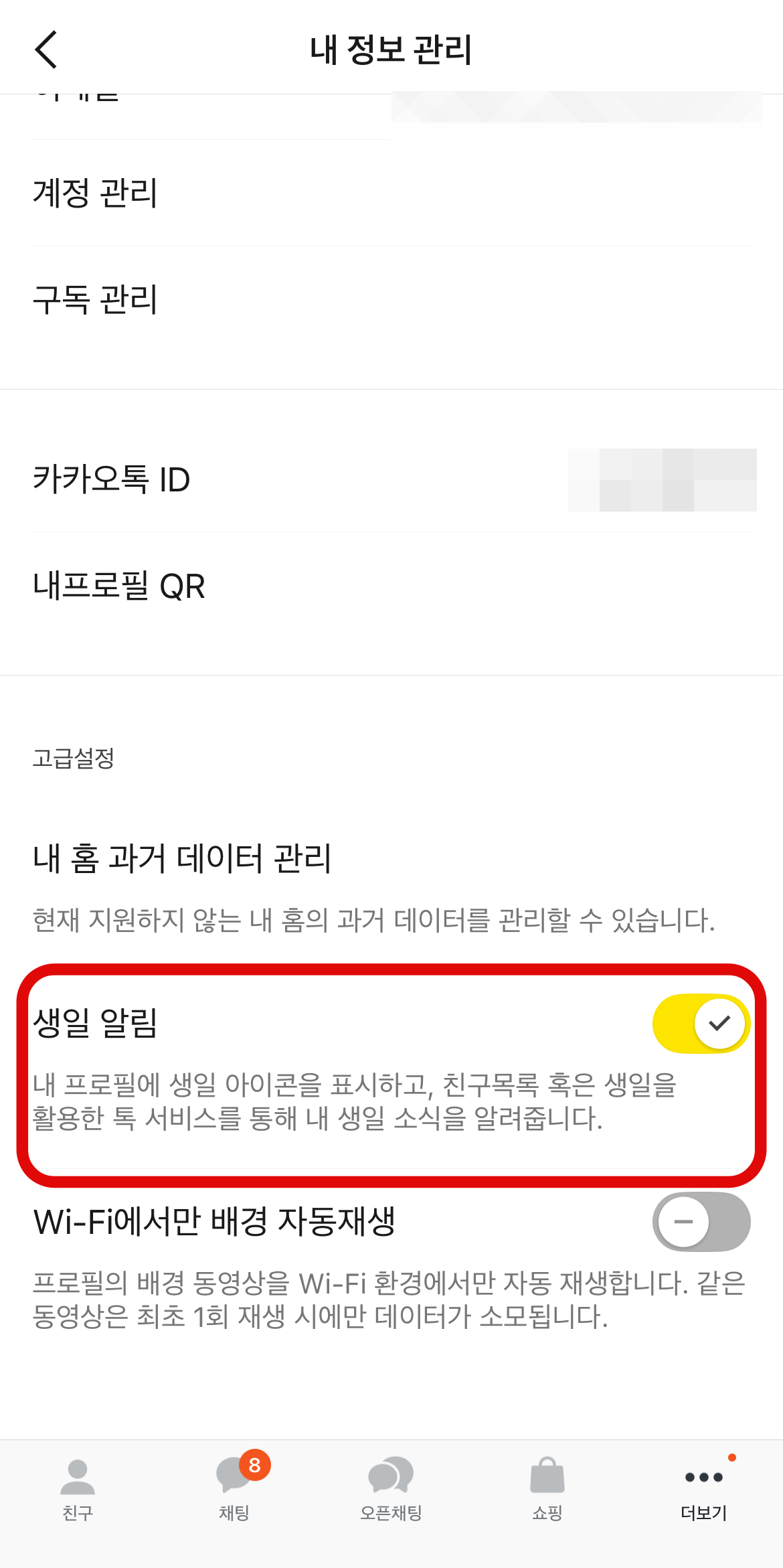카톡 생일 안뜨게 비공개 설정하는 방법은 매우 간단하다. 먼저, 카카오톡에 들어와서 오른쪽 밑에 있는 더 보기를 누르고 오른쪽 위에 있는 설정(톱니바퀴 모양) 버튼을 눌러보자.(톱니바퀴모양을 먼저 누르고 전체설정을 눌러도 상관없다.) 카카오톡의 전반적인 설정을 할 수 있는데 카톡 생일 안뜨게 하기 위해서는 나의 프로필 옆에 있는 관리로 들어간다. 그리고 스크롤을 쭉 내려보면 생일 알림이 활성화되어 있는 것을 볼 수 있을 것이다. 이 버튼을 눌러 비활성화시켜 주면 앞으로는 카톡 생일 안뜨게 될 것이다.