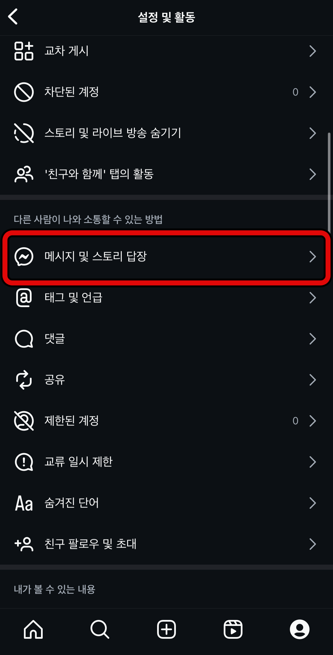인스타 현활 끄기, 활동 중 끄는 방법은 먼저 인스타로 들어가서 오른쪽 아래에 있는 프로필을 누른다. 그리고 오른쪽 위에 있는 선 세 개 버튼을 눌러보자. 인스타에 관한 설정들을 여기서 다 할 수 있는데 여기서 인스타 현활 끄기 위해서는 스크롤을 내려 메시지 및 스토리 답장으로 들어간다.