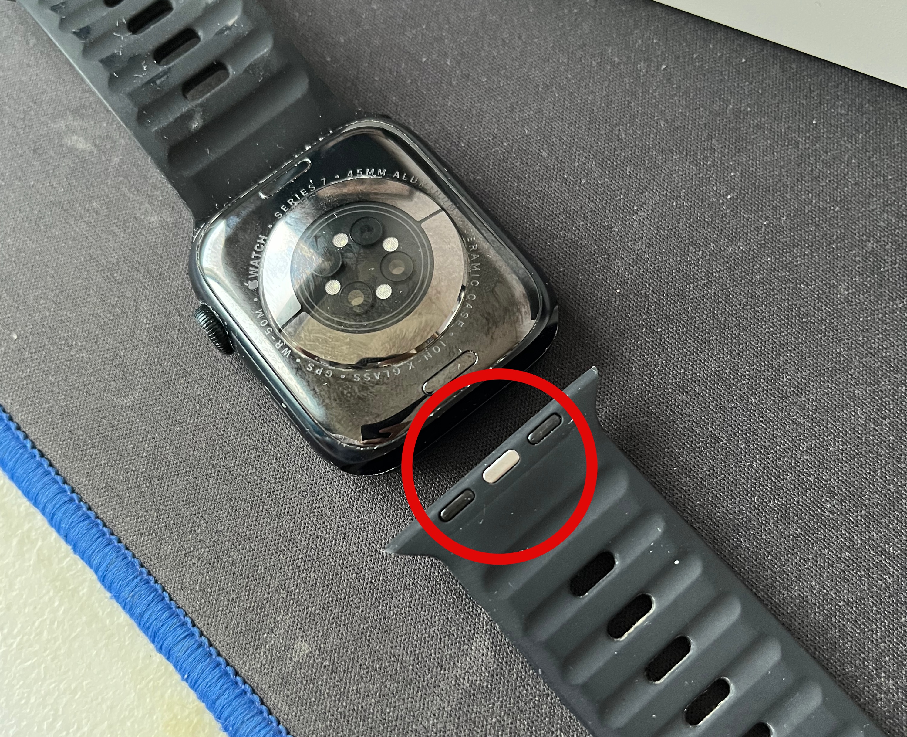 애플워치 스트랩 빼는법은 애플워치 뒷면에 있는 타원형의 버튼을 눌러야 한다. 사진에 보이는 저 버튼이 애플워치와 스트랩을 연결하고 있다. 그래서 저 버튼을 꾹 누르면서 오른쪽이나 왼쪽 방향은 상관없이 밀어 빼주면 된다. 이렇게 쉽게 빠지는데 스트랩을 오래 바꾸지 않았던가 먼지나 이물질이 쌓였다면 버튼이 눌러지지 않는 경우가 있다. 그러할 때 애플워치 스트랩 빼는법도 뒤에 알아보도록 하자.