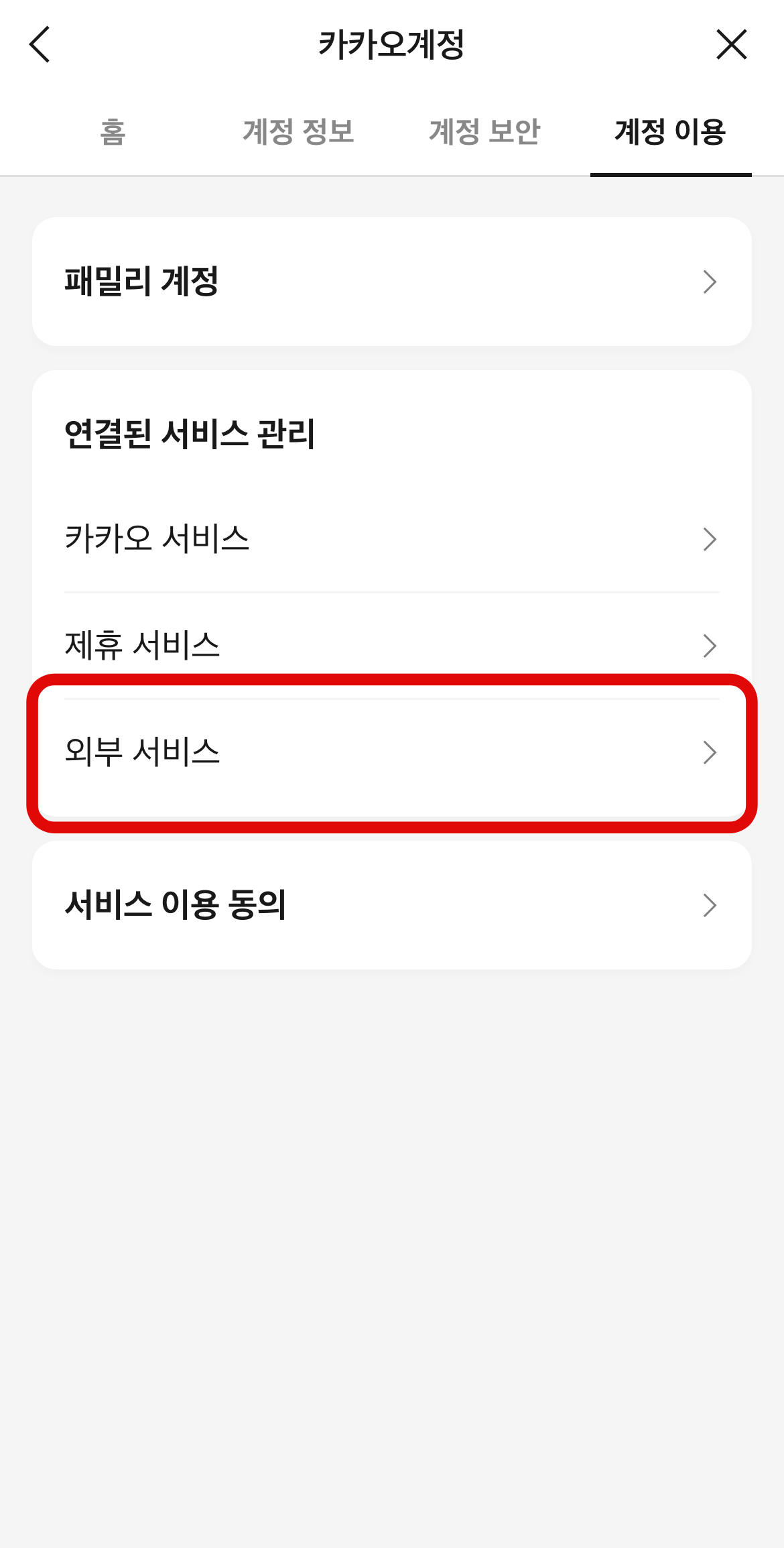 계정 이용에 들어오면 현재 나의 카카오계정과 연결된 서비스들을 볼 수 있다. 여기서 카톡 광고 차단하는 법은 외부서비스로 들어가야 한다. 외부 서비스는 카카오톡 외에 다른 외부 사이트와 연결이 된 서비스를 보여준다. 여기서 자신이 사용하지 않는 서비스에 들어가서 아래에 보이는 연결 해제를 눌러주면 된다. 광고성 메시지가 오지 않더라도 사용하지 않는 서비스가 있다면 연결 해제를 하는 것이 좋다. 나의 정보가 해당 서비스에 제공되는 것을 막아주기 때문이다.