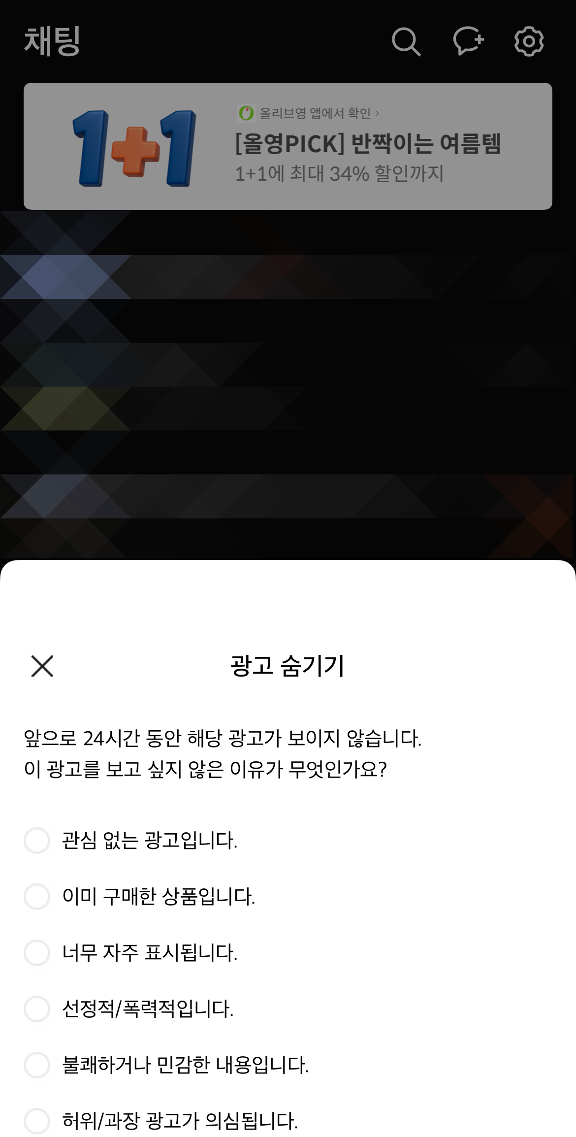 카톡 배너 광고 차단하는 방법은 있지만 없다. 채팅방 가장 위에는 항상 광고가 나오는 것을 볼 수 있다. 이 광고를 왼쪽으로 스와이프 하면 광고를 숨길 수 있는데 현재 나와있던 해당 광고만 24시간 보이지 않게 되며 사라진다. 하지만 다른 광고가 계속해서 나오니 카톡 상단 배너 광고를 아예 삭제하는 방법은 아직까지는 없는 것 같다.