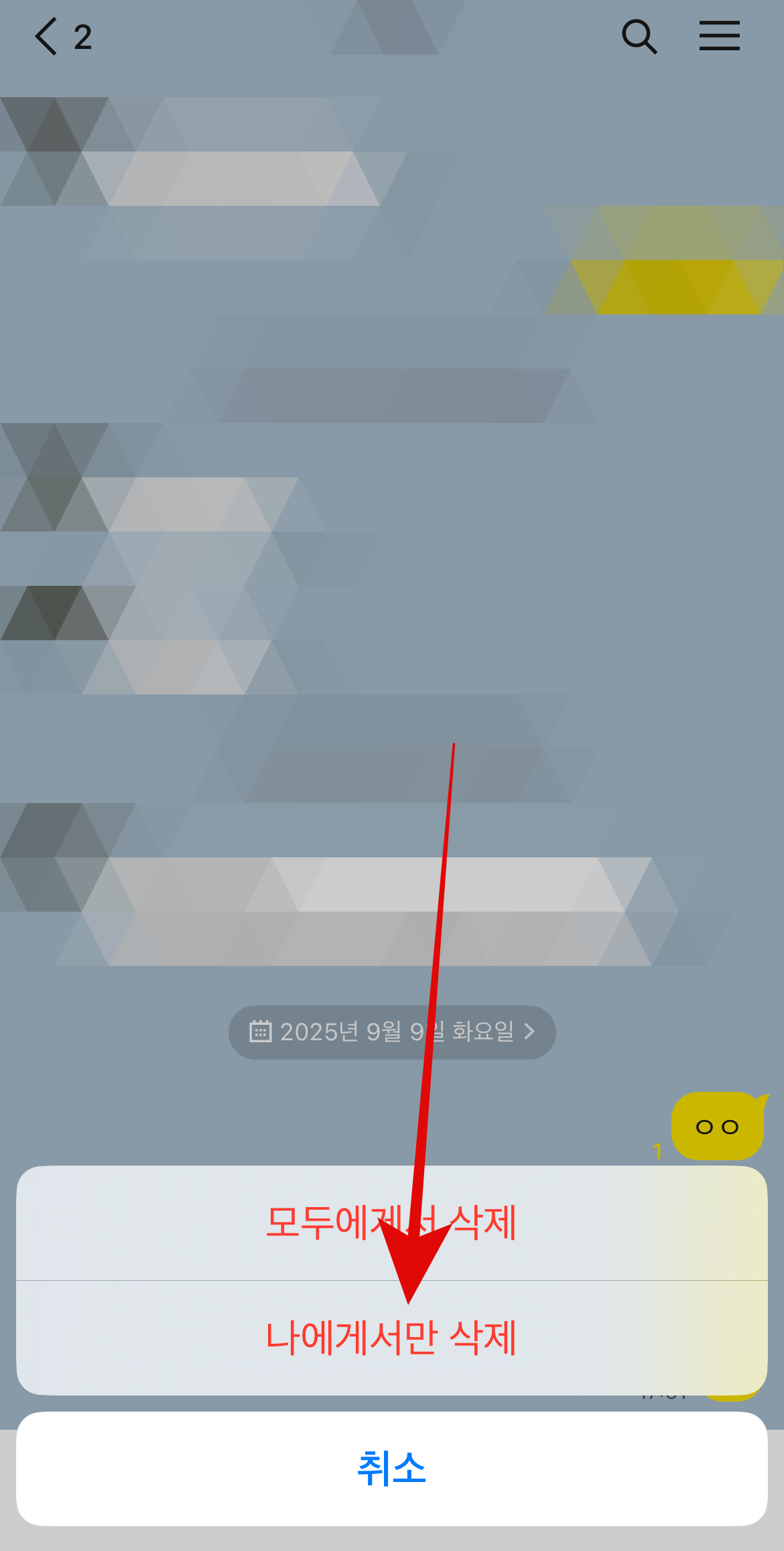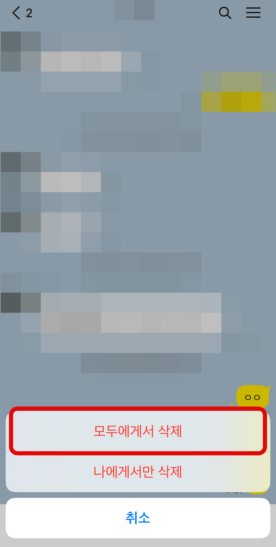 함께 보였던 나에게서만 삭제는 상대방의 카톡방에는 그대로 메시지가 남아있지만 내 카톡방에서만 보이지 않게 되는 것이다. 물론 메시지가 삭제되었습니다.라는 문구도 없이 나의 휴대폰에서만 선택한 메시지가 사라지게 된다. 필요에 따라 두 가지 중 카톡 메시지 삭제를 하면 될 것이다.