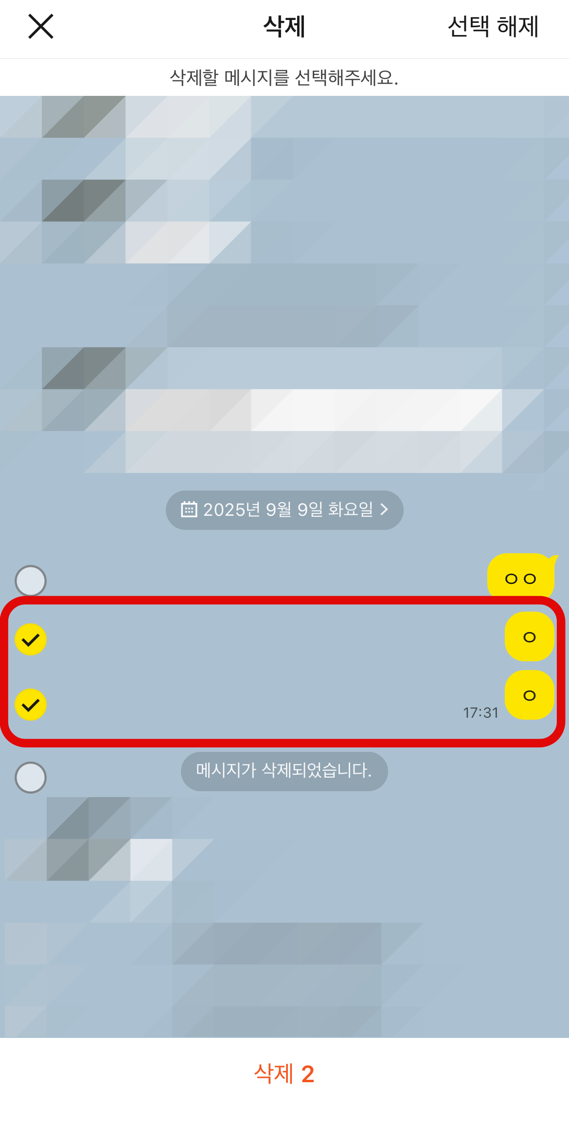 함께 보였던 나에게서만 삭제는 상대방의 카톡방에는 그대로 메시지가 남아있지만 내 카톡방에서만 보이지 않게 되는 것이다. 물론 메시지가 삭제되었습니다.라는 문구도 없이 나의 휴대폰에서만 선택한 메시지가 사라지게 된다. 필요에 따라 두 가지 중 카톡 메시지 삭제를 하면 될 것이다.