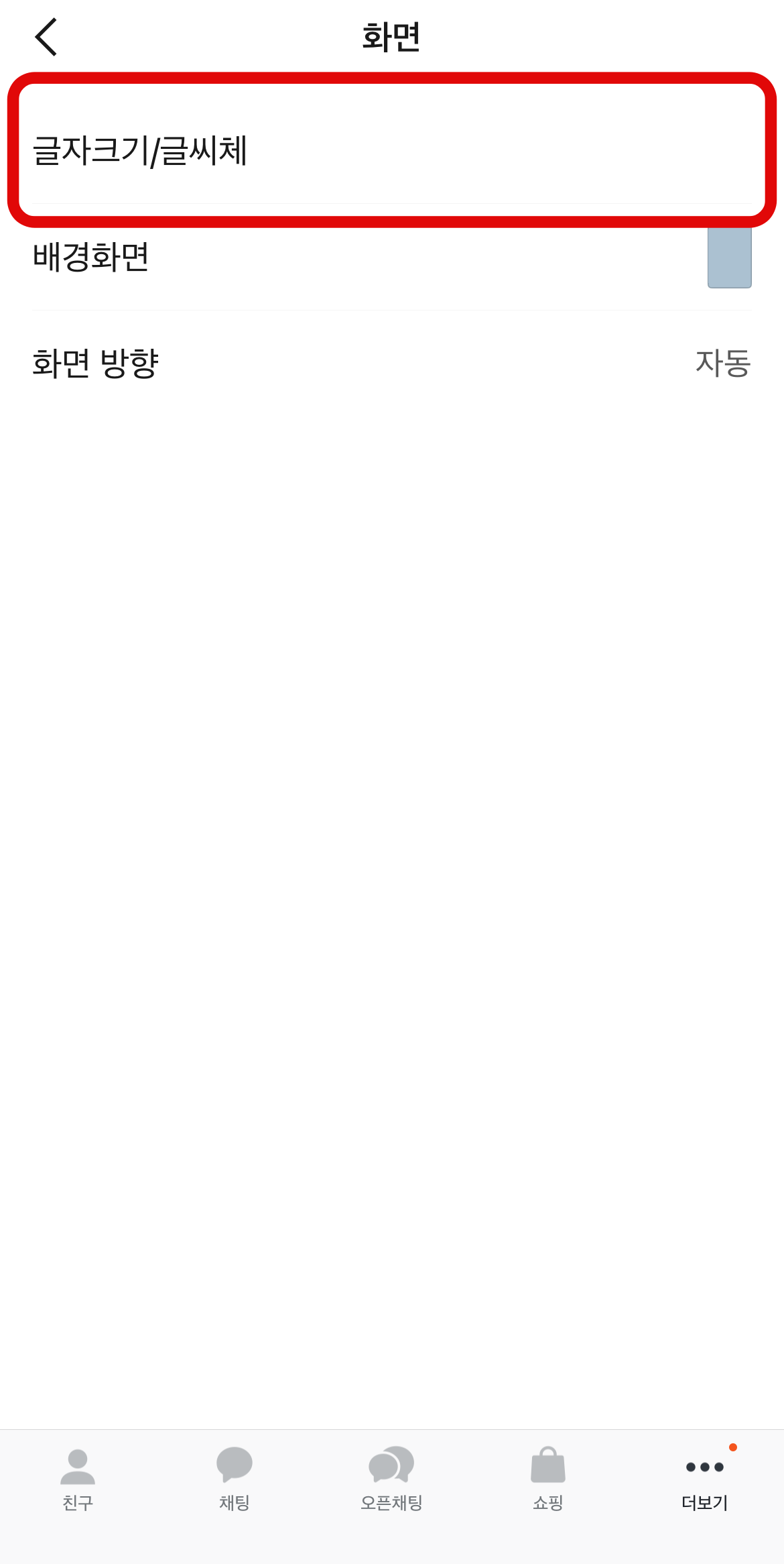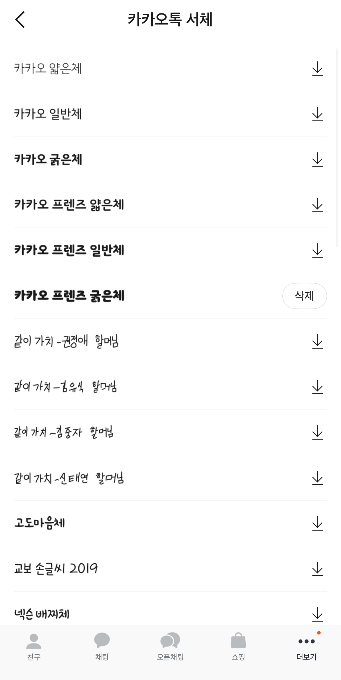 여기서 카톡 글자크기를 조절할 수 있으며 바로 오른쪽에 있는 글씨체를 누르면 카톡 글씨체 변경이 가능하다. 다운로드되어 있는 글씨체가 있다면 아래에서 원하는 글씨체를 선택하면 되고 다운로드되어 있는 글씨체가 하나도 없다면 오른쪽 위에 보이는 더보기로 들어가서 원하는 글씨체를 다운로드하고 돌아오면 그 글씨체가 있어 변경할 수 있다. 여기 있는 글씨체들 말고 다른 글씨체로 설정을 하는 방법도 있다.