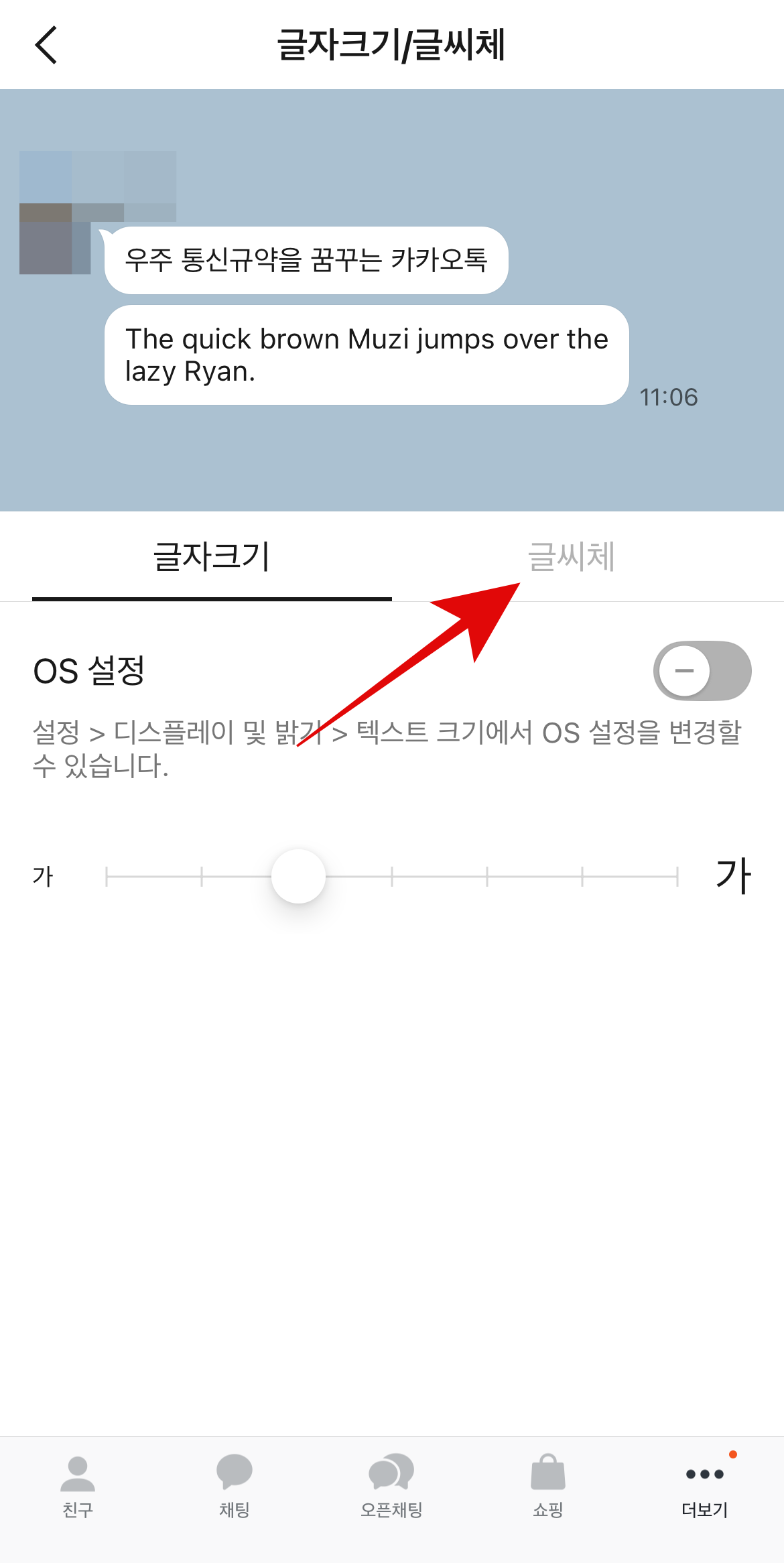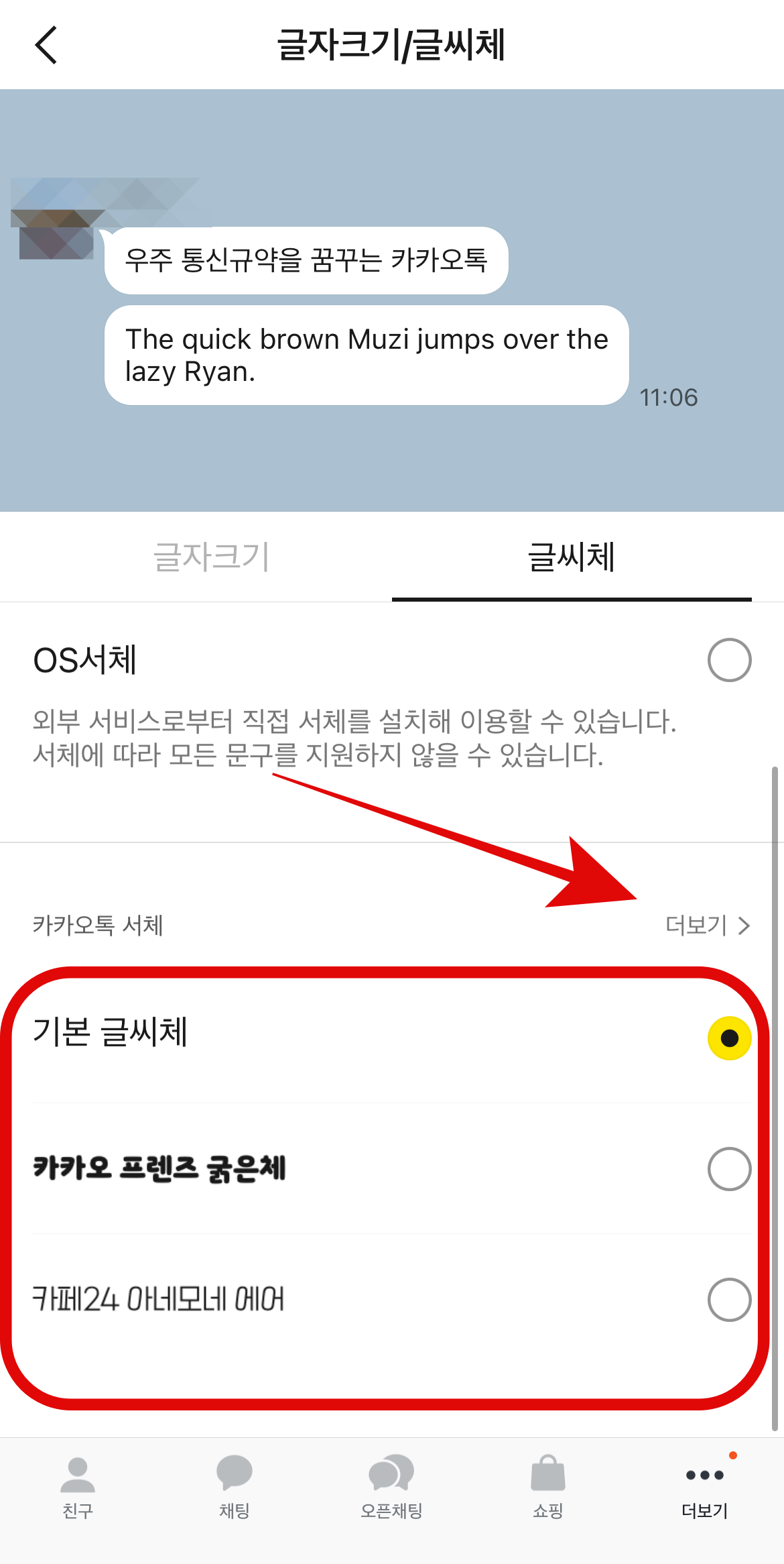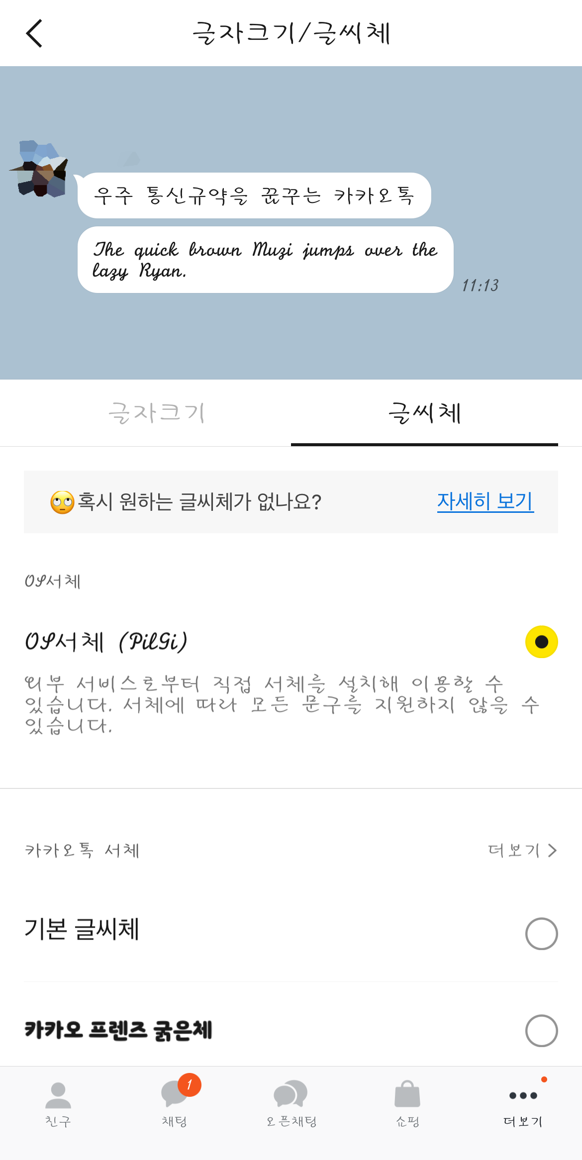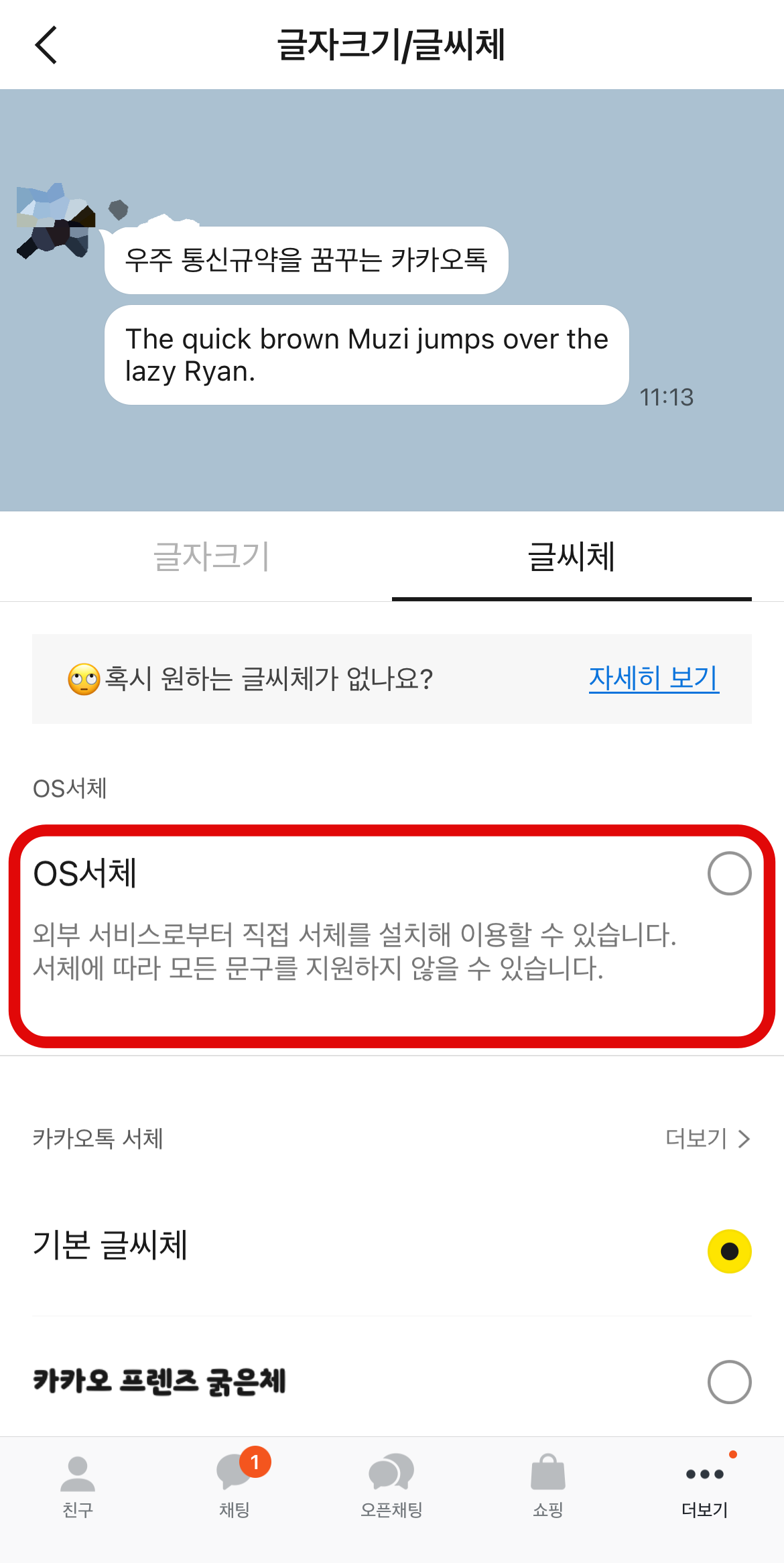 시스템 서체에 들어가서 있는 글씨체를 다운로드 후 카톡으로 돌아와 OS서체를 선택해 주면 방금 선택한 글씨체가 적용되는 것을 볼 수 있다. 여기에도 마음에 드는 글씨체가 많이 없다면 앱스토어에서 '산돌구름'이나 'Rixfont클라우드' 등 서체 관련 어플을 다운로드하여 원하는 글씨체를 다운로드하면 시스템 서체에 추가가 되어 그 글씨체를 사용할 수 있을 것이다.