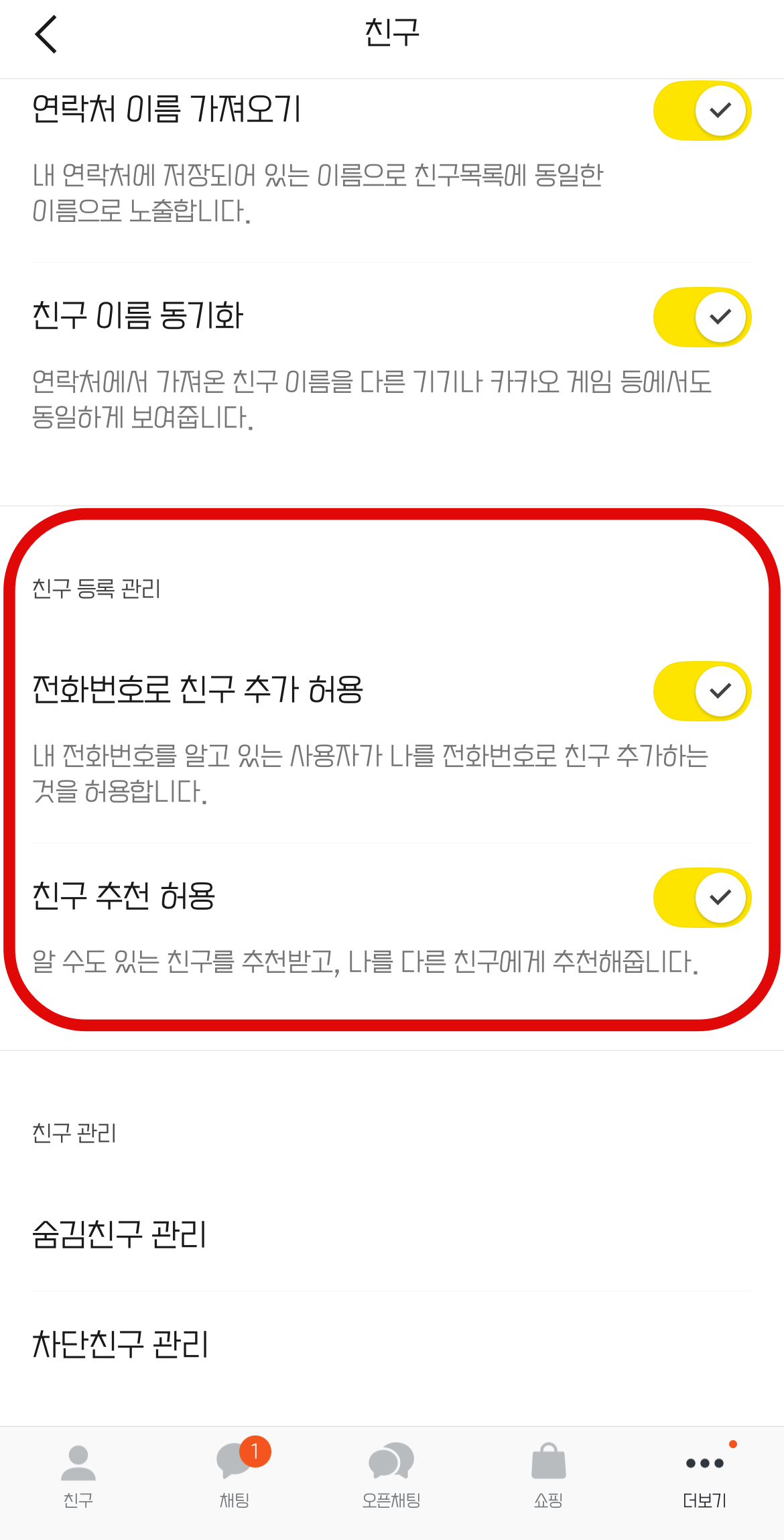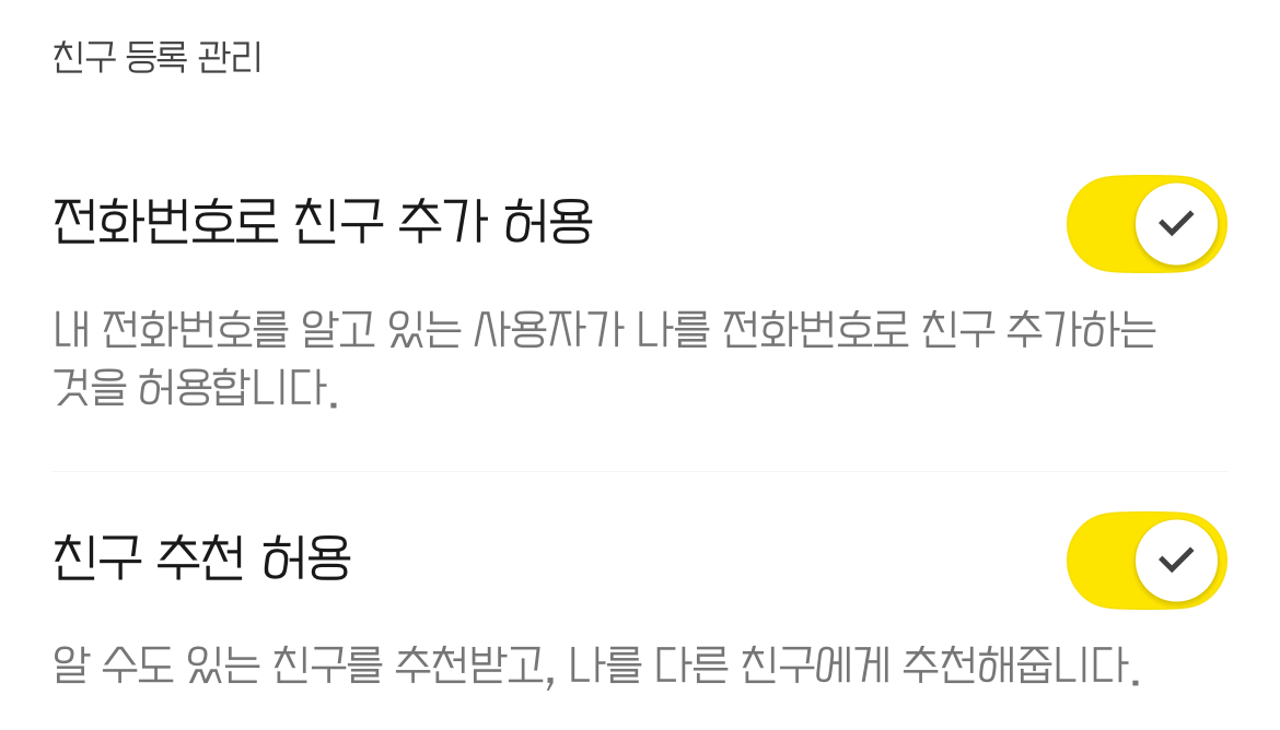 본인에게 맞게 친구 등록 관리를 허용하거나 비허용을 하면 쉽게 나의 카카오톡 친구 추가를 할 수 없을 것이다. 두 가지 모두 비허용을 한다면 친구 추가는 QR코드나 아이디를 직접 검색해야 친구 추가가 가능해진다.
