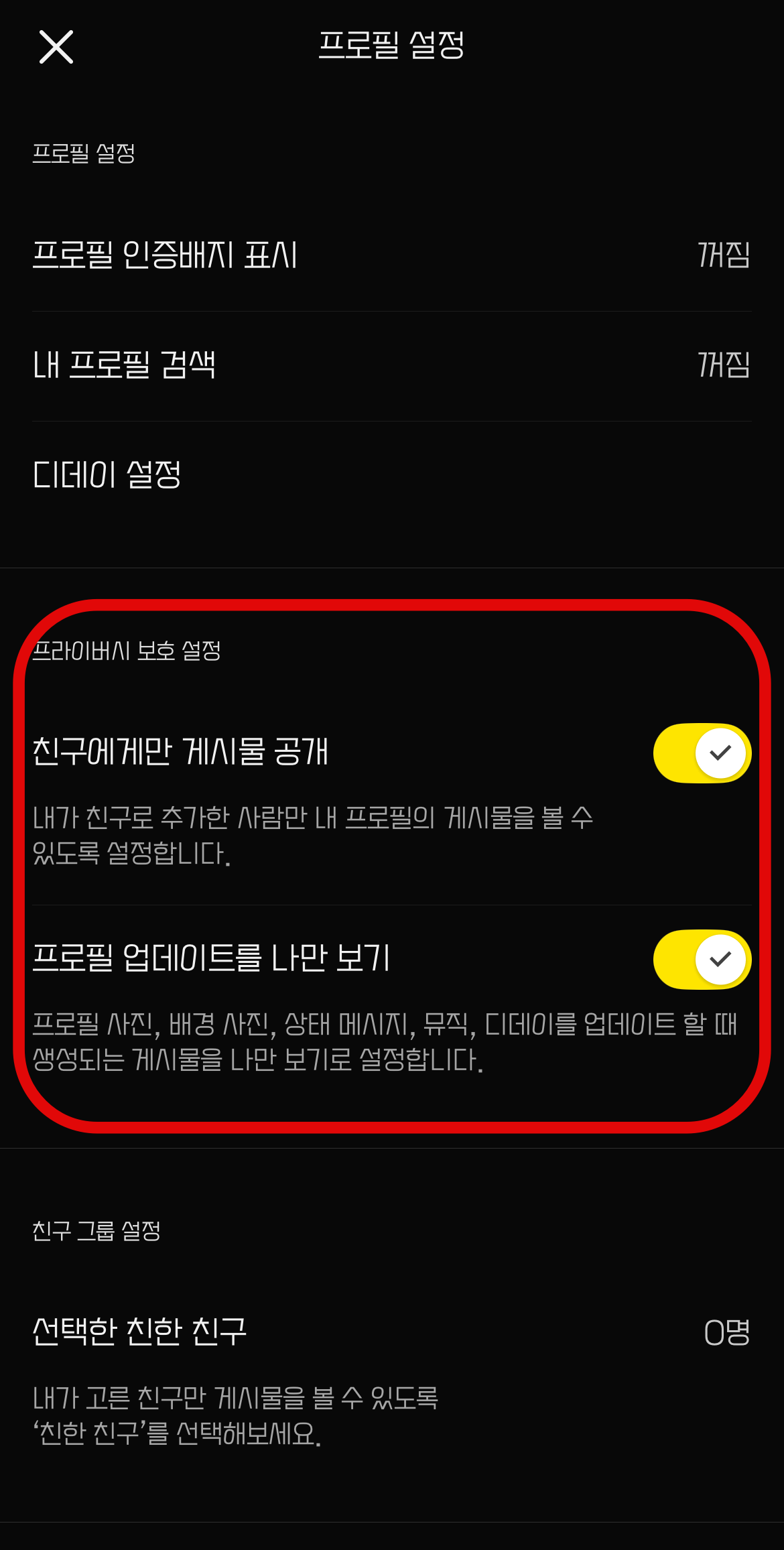 프로필 업데이트를 나만 보기 - 프로필 사진, 배경, 상태메시지 등을 업데이트하면 생성되는 게시물을 나만 볼 수 있게 된다.