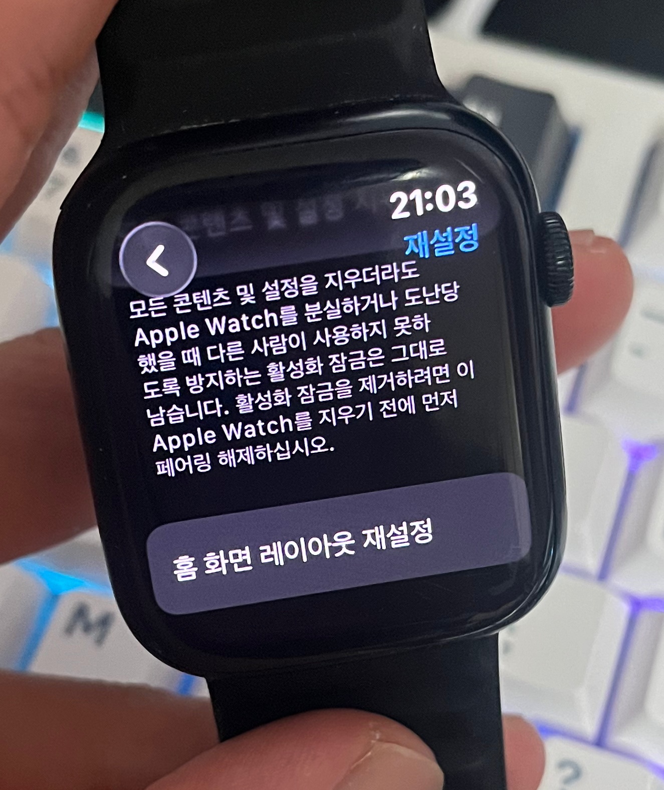 애플워치 재설정을 하기 위해서는 모든 콘텐츠 및 설정 지우기를 눌러 지워주면 된다. 모든 콘텐츠 및 설정을 지우면 구입했을 때의 애플워치로 돌아간다. 하지만 도난 및 분실했을 경우 재사용을 하지 못하게 하기 위해 활성화 잠금은 그대로 유지되므로 완전 재설정을 위해서는 페어링을 해제하고 재설정을 진행해 주면 된다.