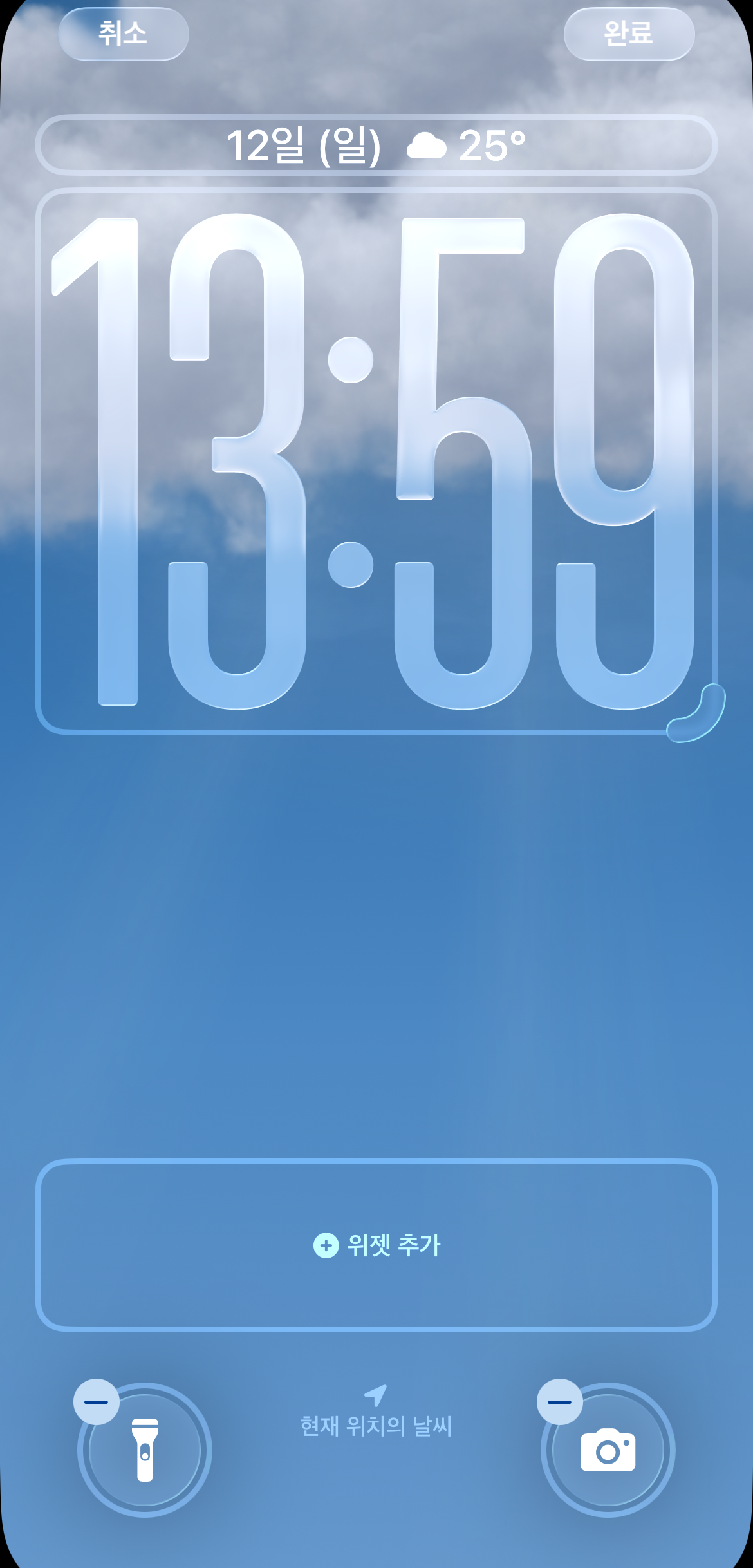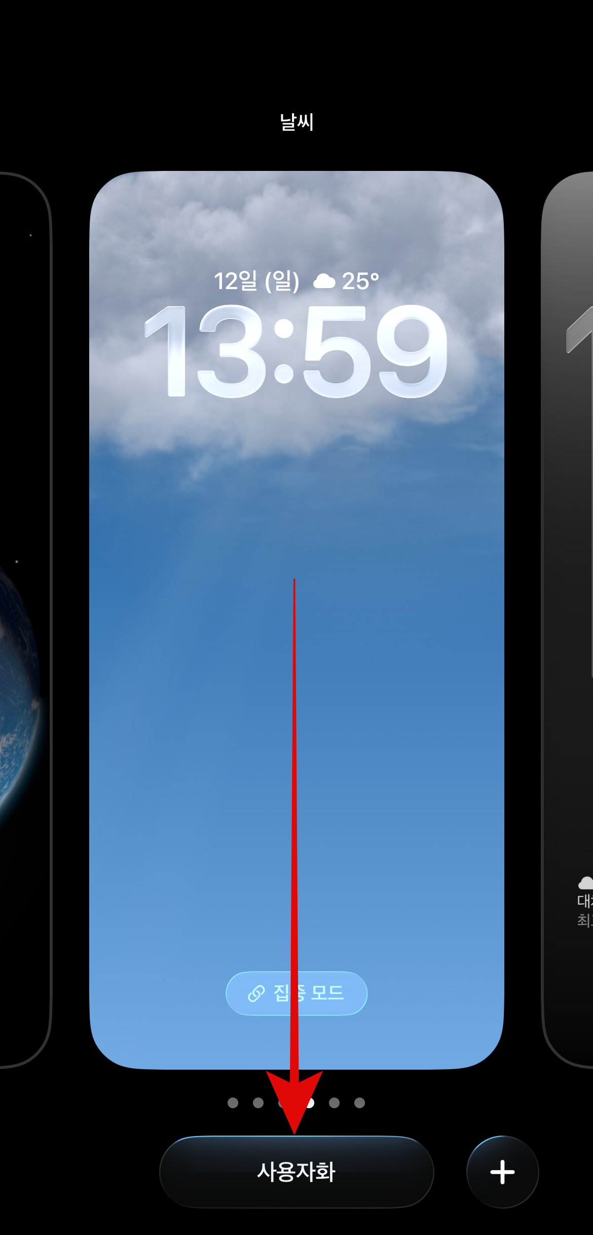 애초에 이모지나 천체의 배경화면을 사용하고 있지 않고 있다면 잠금화면을 꾹 누르고 아래에 있는 사용자화를 통해서도 아이폰 시계 크기 조절이 가능하다. 크기뿐만 아니라 시계를 누르면 모양, 글씨체, 굵기, 색상까지 원하는 대로 설정이 가능하니 배경화면에 맞게 변경하는 것도 재밌을 것이다.