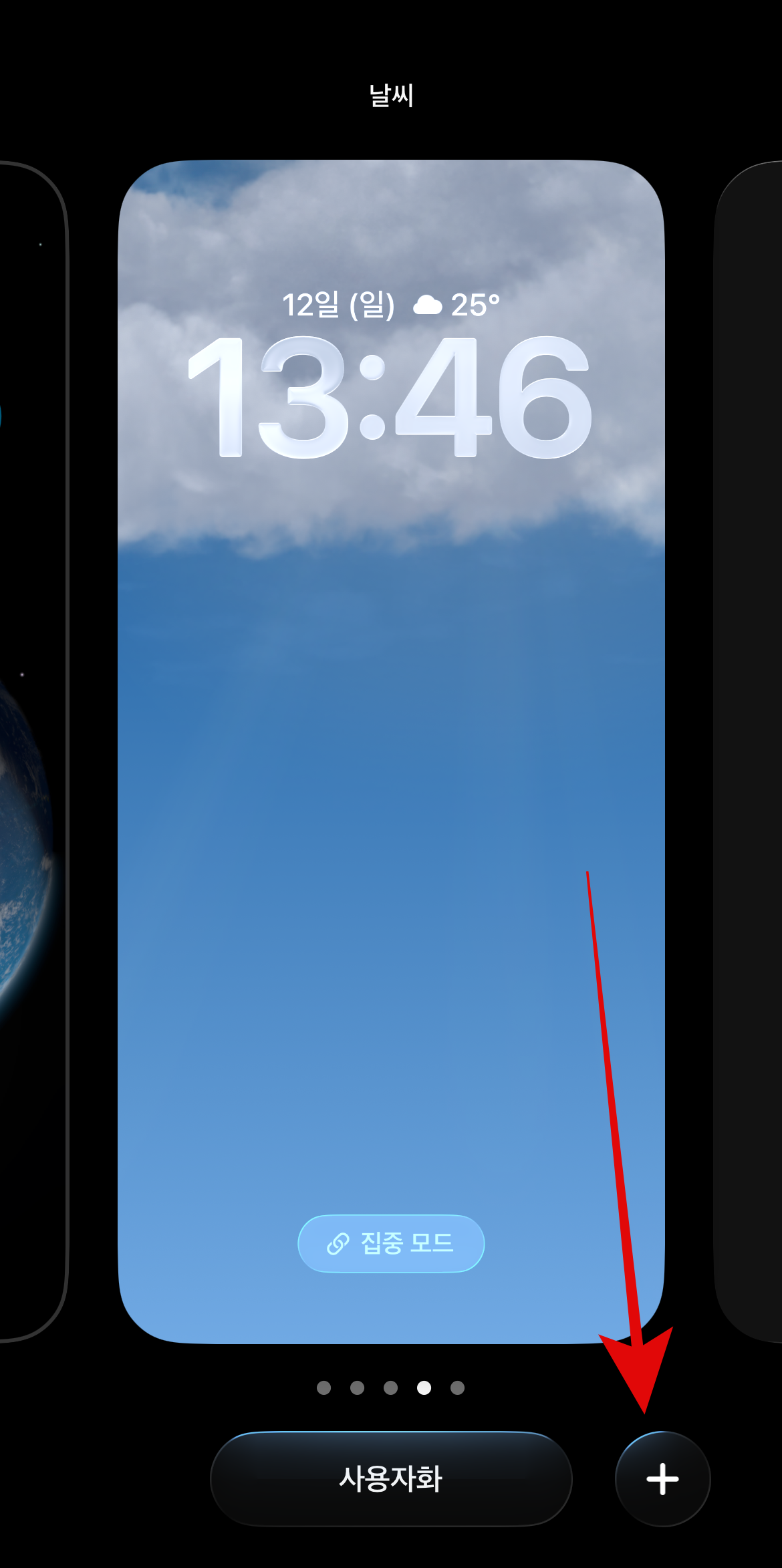 아이폰 시계 크기 조절을 위한 조건은 현재 잠금화면이 이모지나 천체로 되어있으면 시계 크기 조절을 할 수 없다. 그렇다면 새로 만들어서 시계 크기 조절하는 방법에 대하여 알아보자. 먼저 잠금화면에서 빈 공간을 꾹 누르고 오른쪽 아래에 있는 '+' 버튼을 누른다. 여기서도 마찬가지로 이모지나 천체를 제외하고 원하는 배경화면을 정하면 된다.