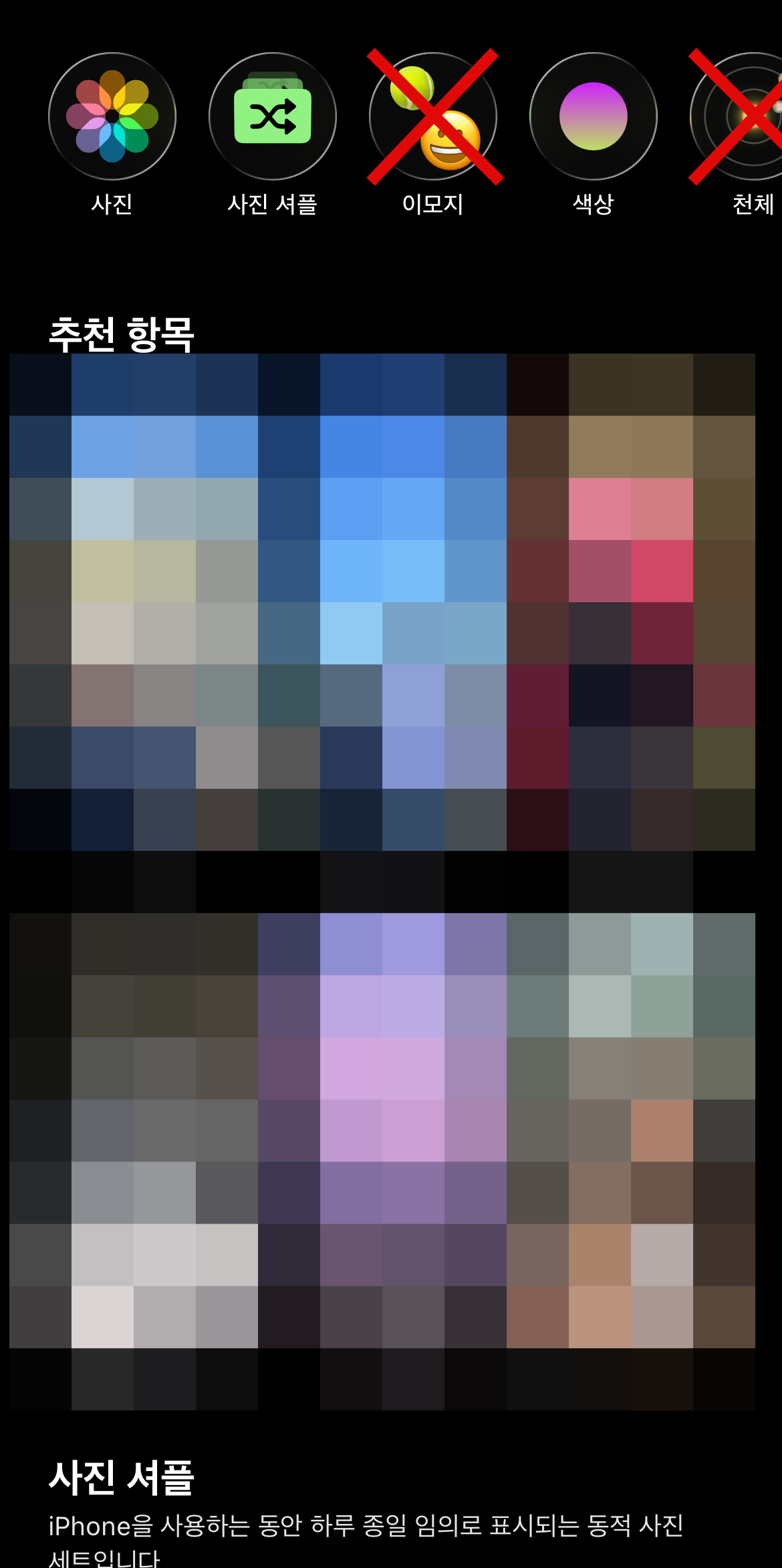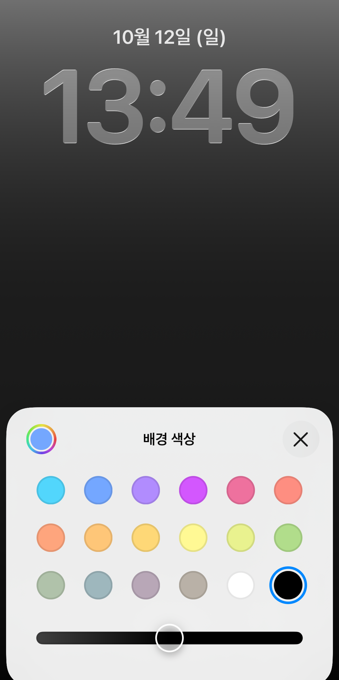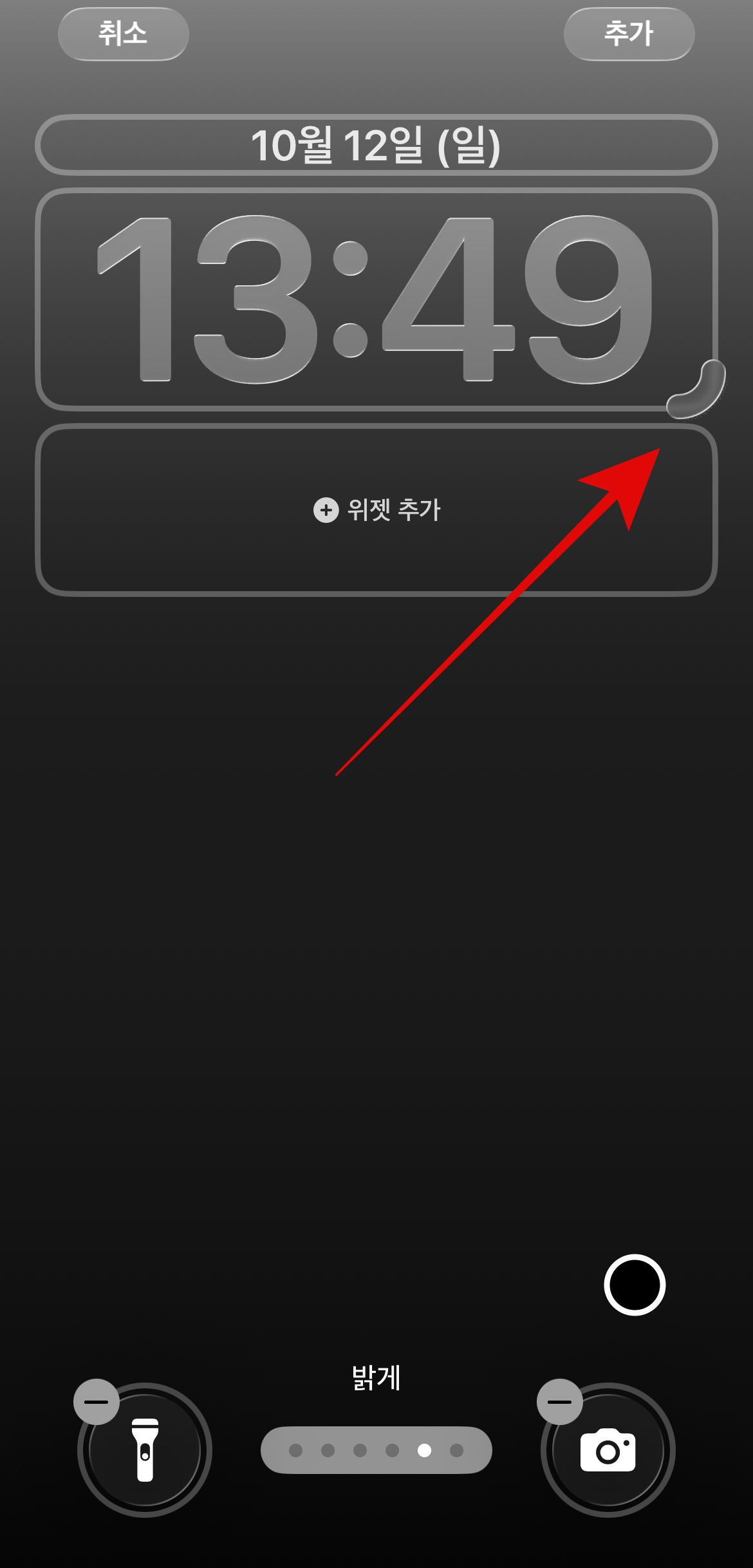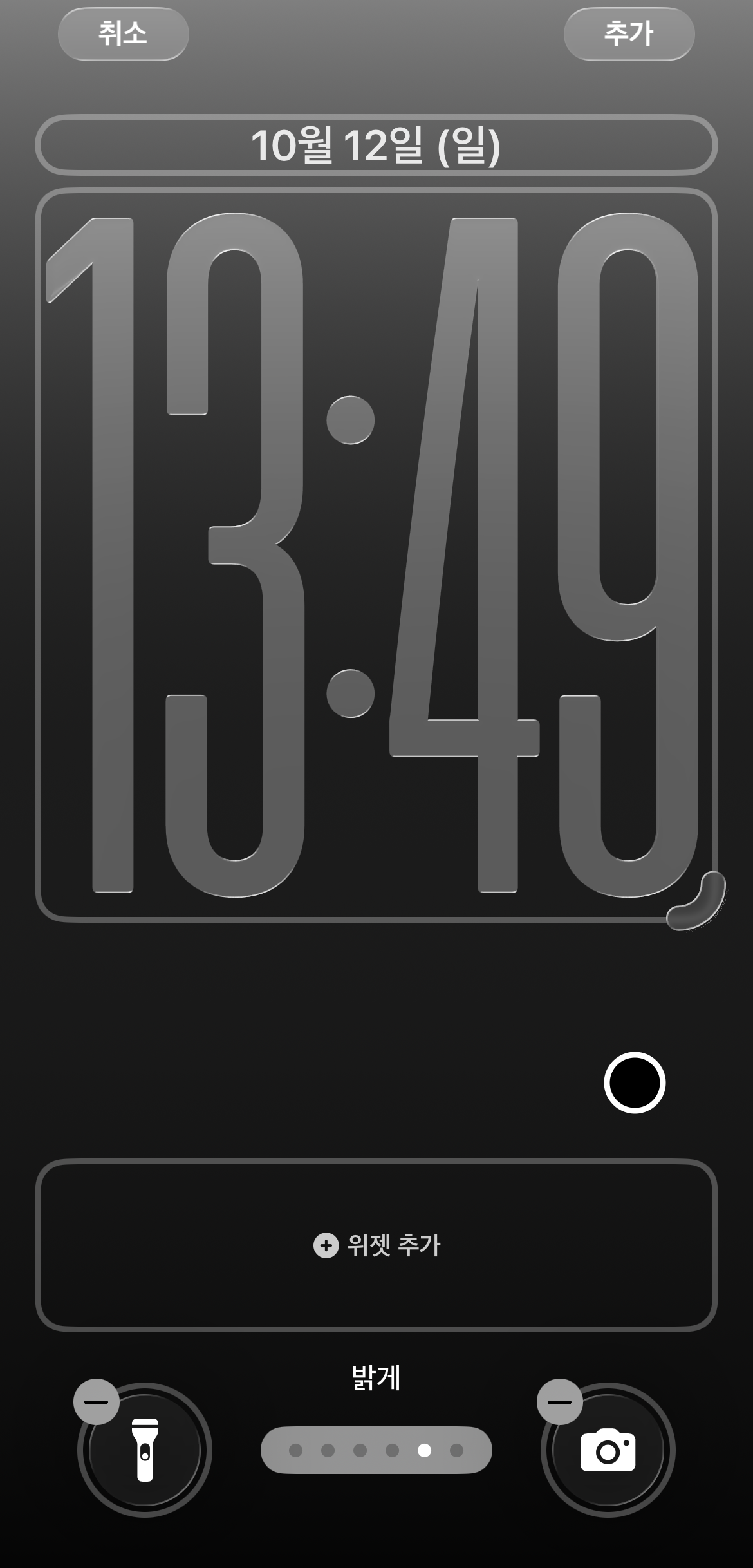 이모지, 천체를 제외하고 배경화면을 선택하면 시계 모양 오른쪽 아래에 버튼 같은 것 이 있을 것이다. 이 버튼을 잡고 쭉 내리면 원하는 크기까지 조절이 가능하다. 가장 왼쪽 사진이 최소크기고 가장 오른쪽 사진이 최대크기이며 더 이상 줄거나 늘어나지 않는다. 시계를 원하는 크기로 설정을 하고 오른쪽 위에 있는 추가 버튼을 누르면 새로운 잠금, 배경화면이 만들어질 것이다.
