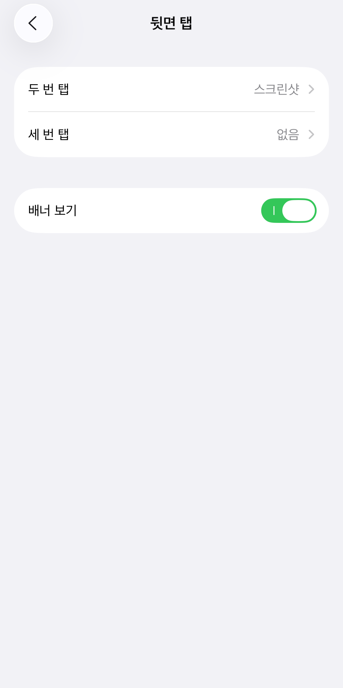 아이폰 뒷면 탭 스크린샷을 설정하고 뒷면 탭을 이용하여 캡쳐를 했을 때 상단에 두번 탭이 감지되었다는 문구와 함께 캡쳐가 되는 것을 볼 수 있을 것이다. 이 배너를 없애고싶다면 아래에 있는 배너 보기를 비활성화시켜주면 상단에 알림이 없이 바로 캡쳐를 할 수 있다. 꼭 스크린샷이 아니라도 원하는 설정을 통하여 아이폰 뒷면 탭을 활용해 보도록 하자.