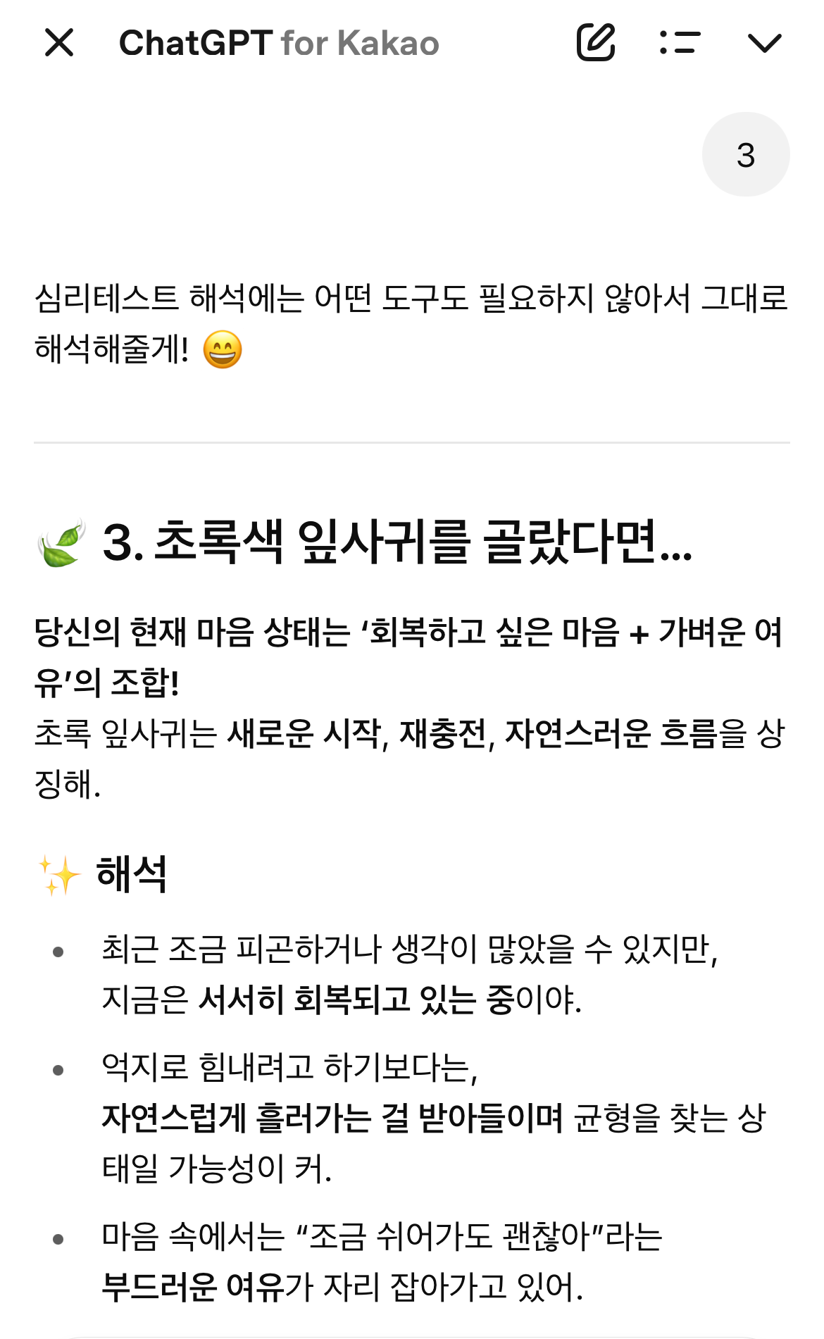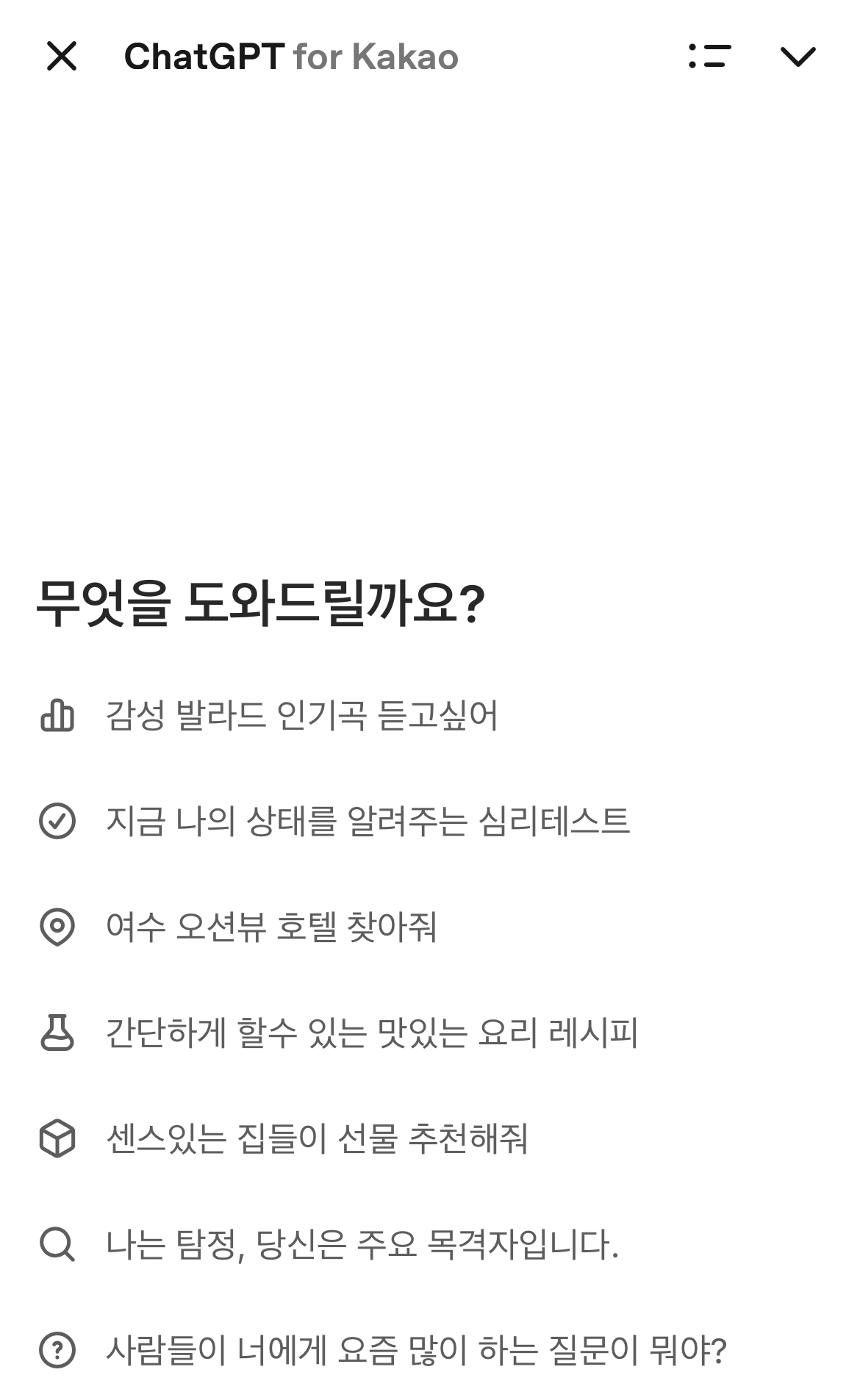 카카오톡 쳇지피티는 다양하게 사용을 할 수 있다. 내가 궁금했던 것을 질문하거나 소소하게 점심, 저녁 메뉴를 추천받을 수도 있다. 그리고 요즘 유행하는 선물이나 음악을 추천받고 심리테스트나 날씨도 채팅하듯이 가능하다. 쳇지피티는 알고 있었으나 다운로드해서 로그인하고 하는 것이 귀찮아서 사용하지 않았던 사람들은 카카오톡에 연동이 되어 편리하게 사용이 가능할 것이다.
