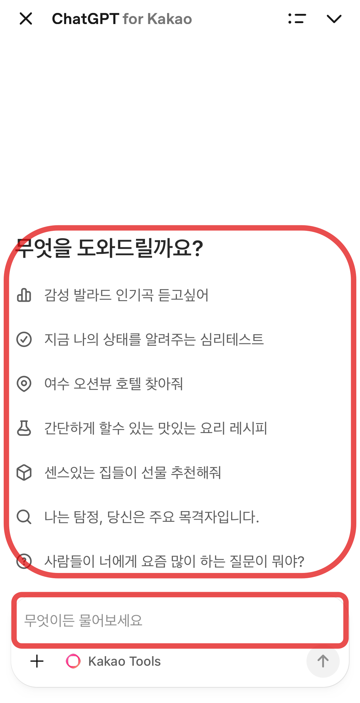 카카오톡 쳇gpt는 카카오톡을 최신 버전으로 업데이트하고 채팅방으로 들어오면 바로 찾을 수 있다. 쳇지피티를 누르면 개인정보동의를 하고 카카오톡 로그인으로 바로 사용이 가능하다. 궁금한 것을 바로 질문해도 되고 추천을 해주는 질문을 눌러 채팅을 시작해도 된다.