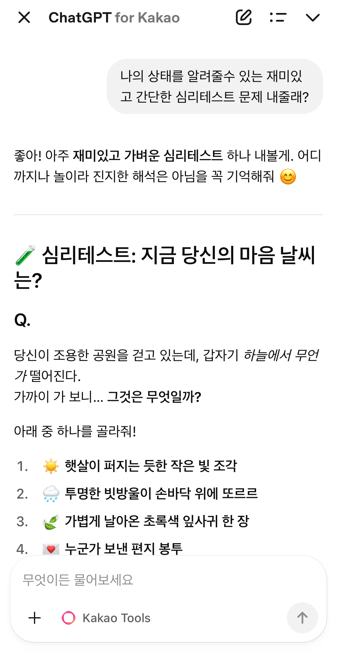 카카오톡 쳇지피티는 다양하게 사용을 할 수 있다. 내가 궁금했던 것을 질문하거나 소소하게 점심, 저녁 메뉴를 추천받을 수도 있다. 그리고 요즘 유행하는 선물이나 음악을 추천받고 심리테스트나 날씨도 채팅하듯이 가능하다. 쳇지피티는 알고 있었으나 다운로드해서 로그인하고 하는 것이 귀찮아서 사용하지 않았던 사람들은 카카오톡에 연동이 되어 편리하게 사용이 가능할 것이다.