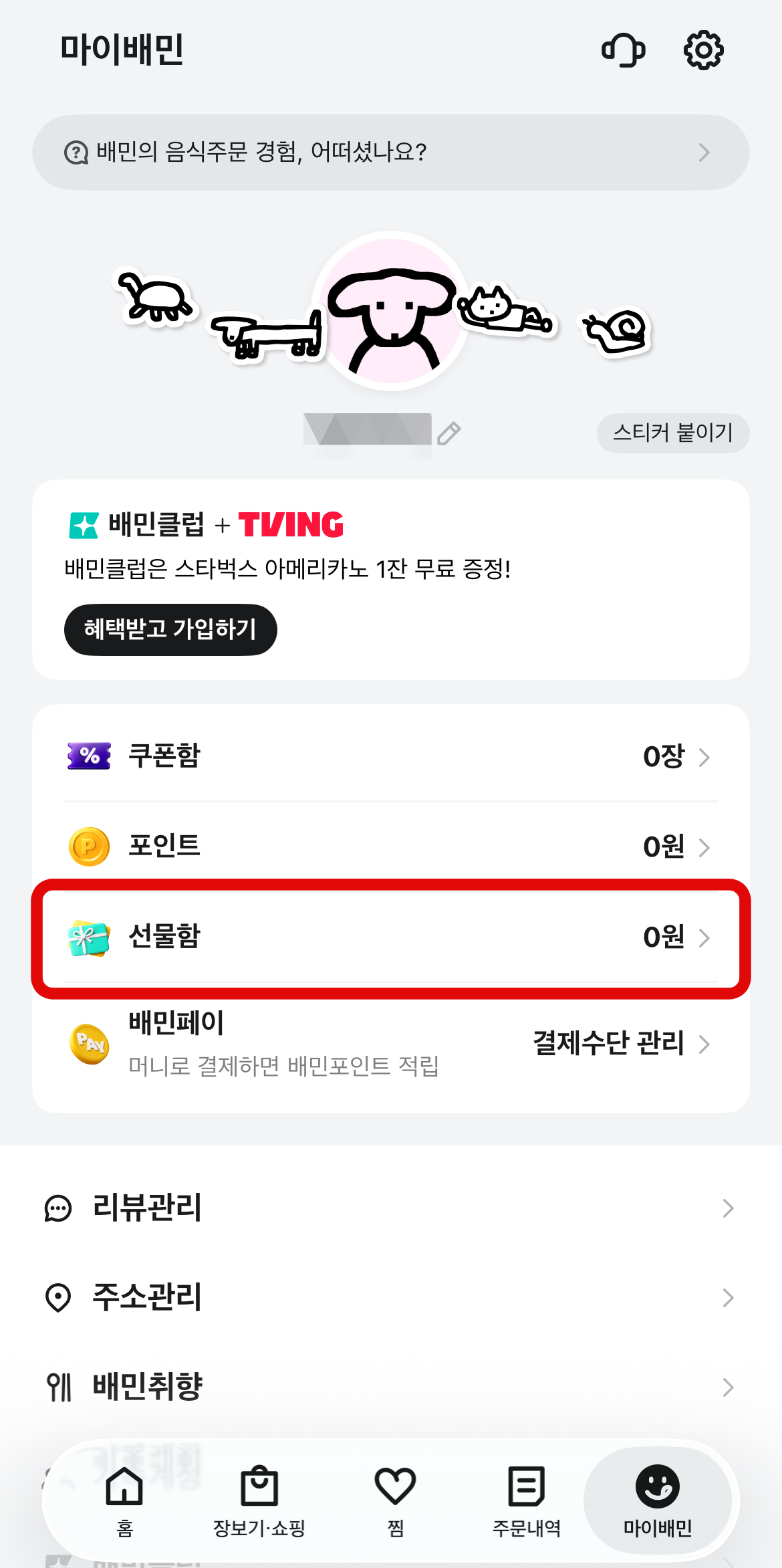 배민 쿠폰 사용법은 두 가지 방법이 있다. 쿠폰만 먼저 등록하는 방법이 있고 주문을 하면서 쿠폰을 사용하는 방법이 있다. 먼저, 원하는 배달음식을 장바구니에 담고 배달 방법까지 선택하여 결제 전 단계까지 진행시켜 보도록 하자. 여기서 스크롤을 내리면 쿠폰을 등록할 수 있는 칸이 있을 것이다. 두 번째에 있는 선물함으로 들어가 보도록 하자.