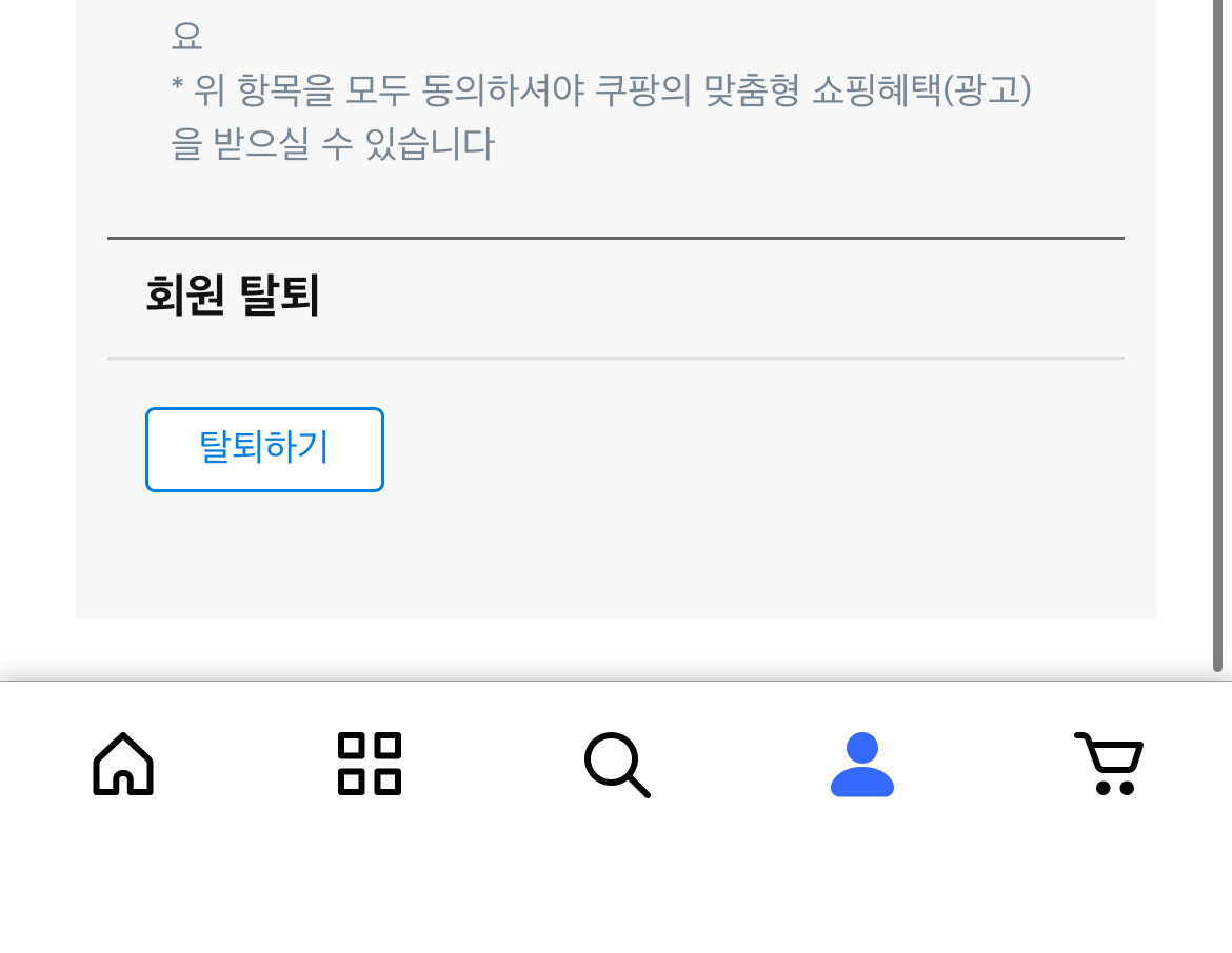 쿠팡 회원 탈퇴를 위해서 쿠팡에 들어와서 가장 아래의 목록 중 사람 모양을 눌러 내정보로 들어간다. 그리고 오른쪽 위에 있는 톱니바퀴(설정) 모양을 눌러 내 정보 관리로 들어갈 수 있다. 여기서 나의 이름 오른쪽에 보이는 파란 글씨의 회원정보 수정>을 눌러보도록 하자. 여기서 로그인 시 비밀번호가 필요하다.