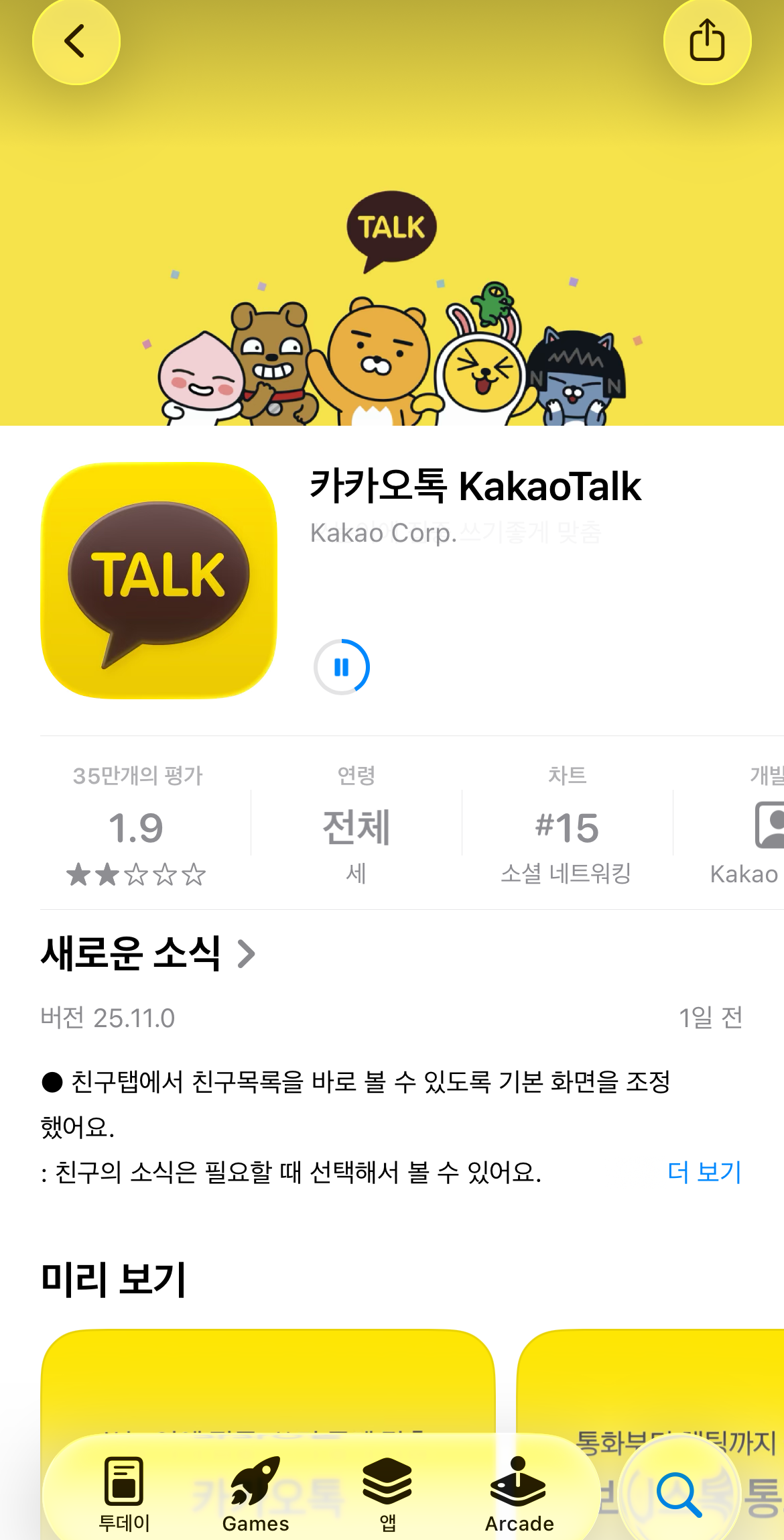 카카오톡 업데이트를 진행하면 친구목록이 원래대로 되돌아오는 것을 확인할 수 있을 것이다. 꼭 이렇게 들어가지 않고 앱스토어나 플레이스토어에 들어가서 25.11.0 업데이트를 진행만 해주면 된다. 카카오톡 자동 업데이트틀 꺼둔 사람이라면 자동으로 업데이트가 되지 않으니 이러한 방식으로 업데이트를 진행해 주면 된다.