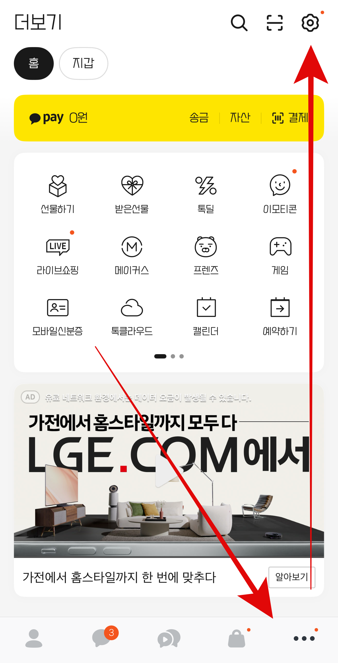 카카오톡 업데이트 원래대로 돌리는 방법은 카톡을 다시 최신 버전으로 업데이트를 하면 된다. 업데이트를 하는 방법은 몇 가지가 있는데 먼저, 공지사항에서 업데이트 내용을 확인하고 업데이트를 하는 방법이다. 카카오톡에 들어와서 오른쪽 아래에 있는 점 3개 버튼을 누른다. 그리고 위에 있는 톱니바퀴 모양을 눌러 설정으로 들어가 보자. 스크롤을 쭉 내려 공지사항에 들어가서 25/12/15에 등록된 공지사항 '25.11.0 업데이트 안내'를 눌러 들어가자.