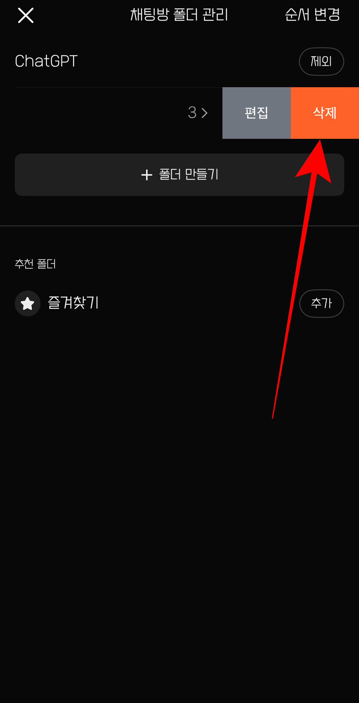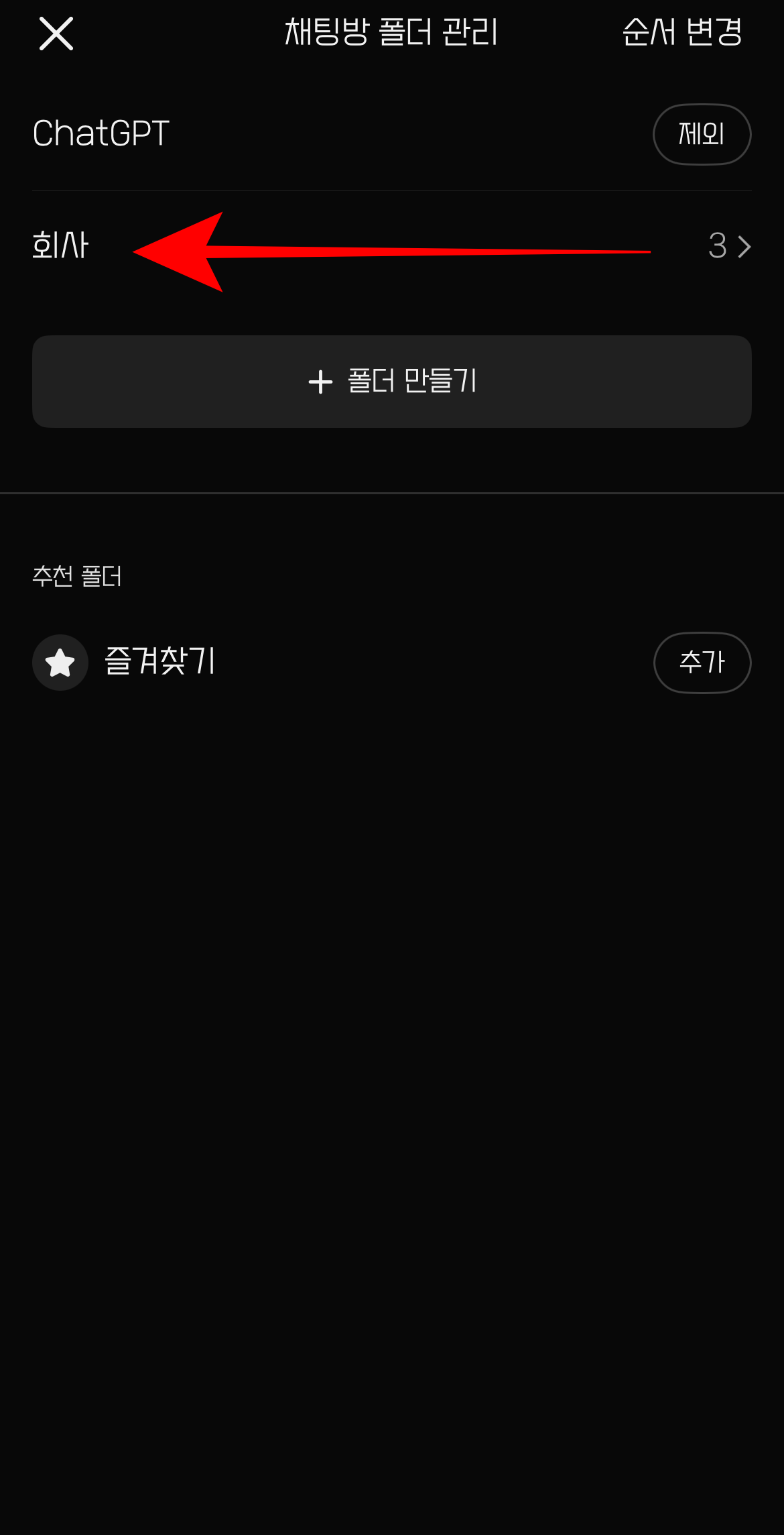 바로 위에 있는 쳇지피티 제외를 누르면 쳇지피티가 사라질 것이며 또 그 위에 있는 순서 변경을 눌러 순서를 내 마음대로 설정을 할 수 있다.