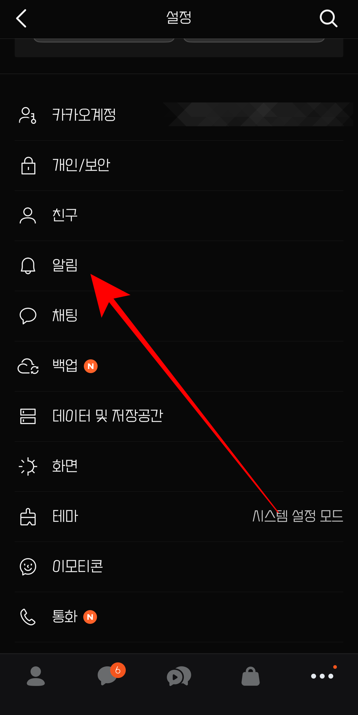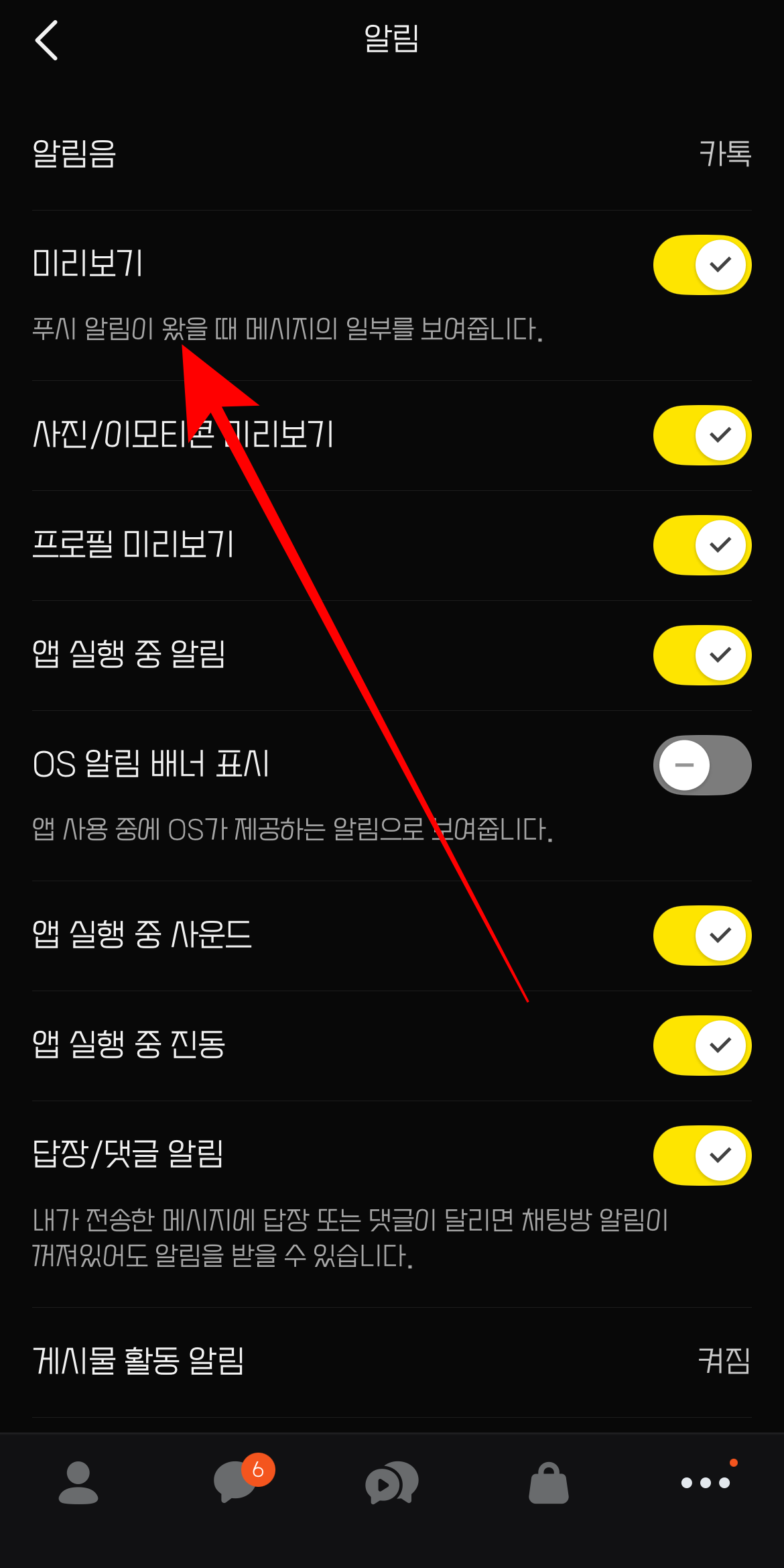 마지막으로 카톡 미리보기 방법은 카카오톡의 기능을 사용하는 것이다. 카카오톡에 들어와서 오른쪽 밑에 있는 점 3개를 누르고 오른쪽 위에 있는 톱니바퀴 모양을 눌러 카카오톡 설정으로 들어가 보자. 여기서 카카오톡에 관한 설정을 할 수 있는데 카톡 미리 보기를 위해서는 알림으로 들어간다. 알림으로 들어가면 미리 보기가 가장 먼저 보일 것이다. 이 미리 보기 기능을 켜주면 카카오톡을 읽기 전에 미리 카톡을 확인할 수 있다.