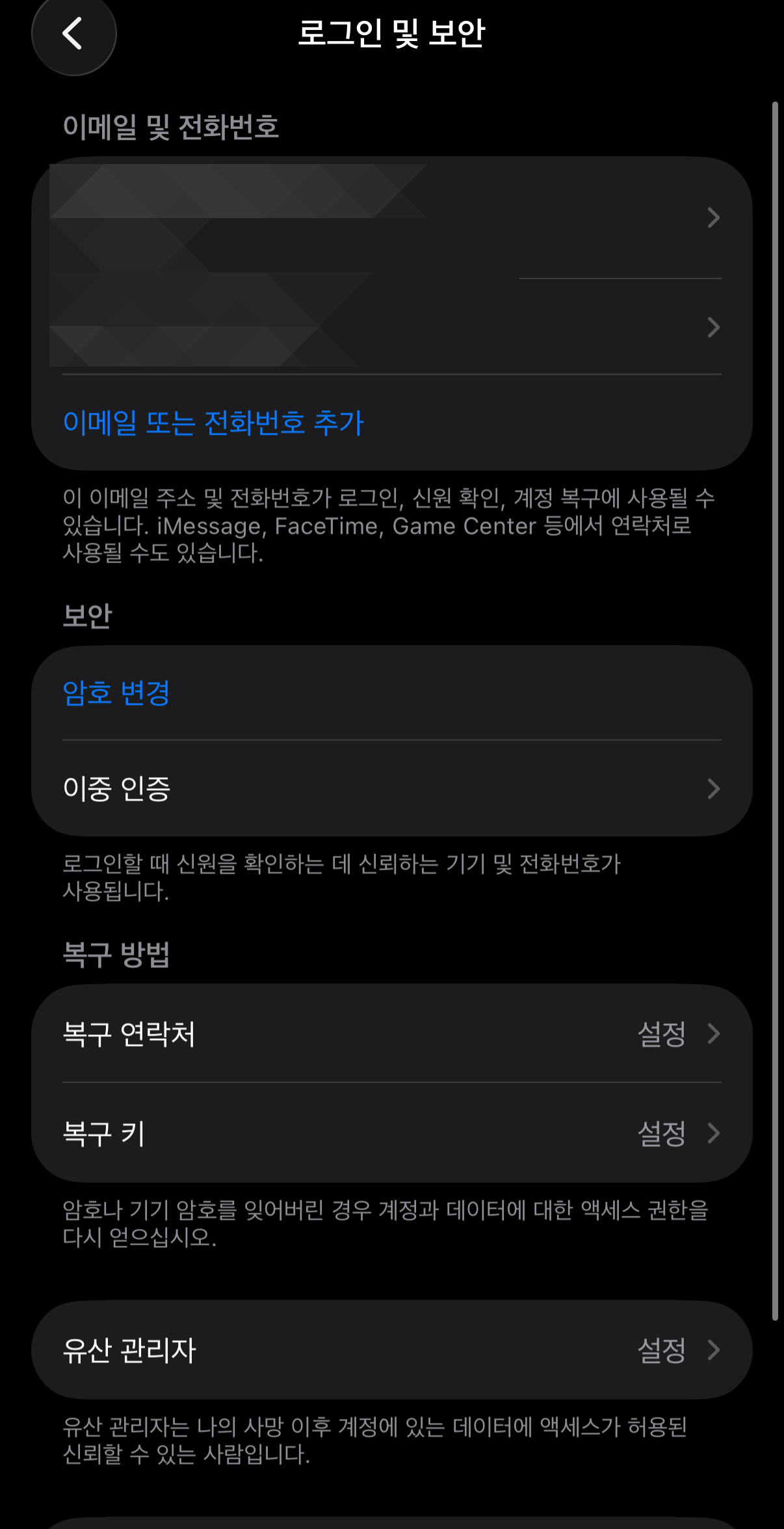 아이폰 해킹 확인법, Apple ID 유출이 의심되는 경우 확인해봐야 할 곳은 바로 애플 로그인 정보이다. 설정에 들어가서 가장 위에 있는 나의 프로필을 눌러 들어간다. 그리고 로그인 및 보안으로 들어가 보자. 여기에 나의 휴대폰, 이메일 말고 내가 모르는 기기나 정보가 있다면 즉시 비밀번호 변경을 하고 이중 인증까지 설정하도록 하자.
