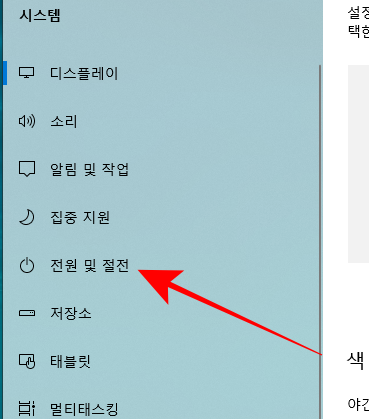 컴퓨터 자동종료 설정 말고 절전모드와 화면 꺼짐 시간 설정하는 방법에 대하여도 알아보도록 하자. 먼저, 컴퓨터 설정에 들어가서 시스템으로 들어간다. 그리고 왼쪽 카테고리에서 전원 및 절전으로 들어가 보자.
