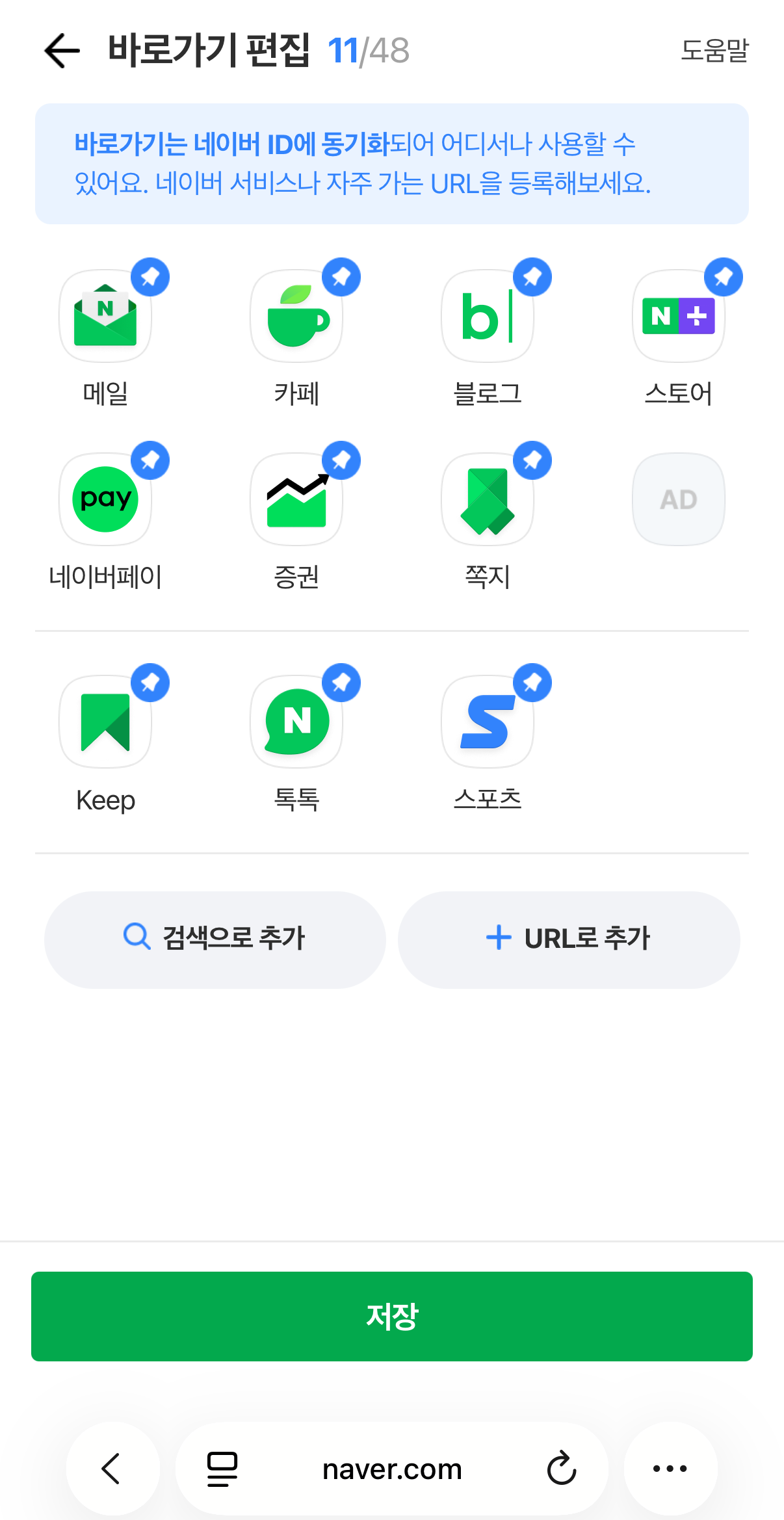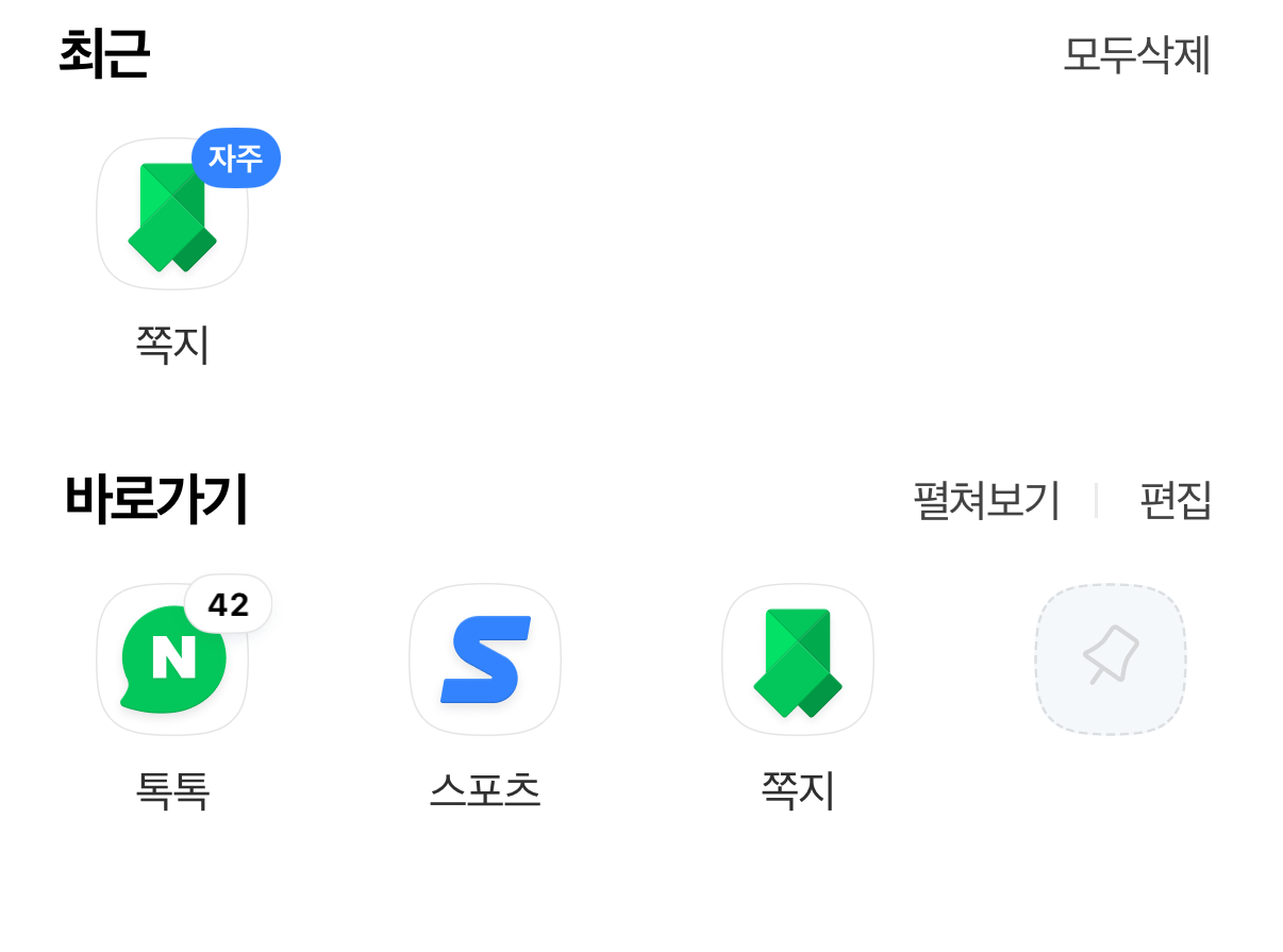 검색으로 추가를 누르고 쪽지를 검색한다. 쪽지 오른쪽에 보이는 핀 버튼을 눌러 파란색이 들어오게 고정을 하자. 아래에 바로가기에 추가되었습니다.라는 문구를 확인할 수 있을 것이다. 그리고 뒤로 돌아가보면 아까는 없던 쪽지가 새로 만들어진 것을 볼 수 있다. 이 버튼을 눌러서 네이버 쪽지가 오는지 몇 개가 왔는지 확인할 수 있을 것이다.