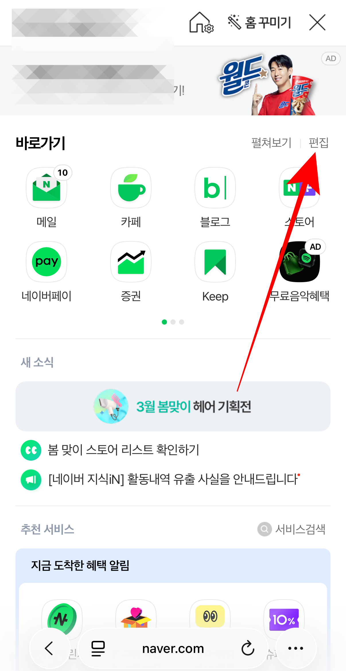 네이버 쪽지 보는법은 먼저, 네이버 어플에 들어온다. 네이버 어플이 아니라 사파리나 인터넷으로 네이버에 접속을 해도 된다. 네이버를 켜고 로그인을 한 후에 왼쪽 위에 있는 선 3개 버튼을 눌러보자. 그러면 바로가기에 메일, 카페, 블로그 등이 있을 텐데 쪽지는 보이지 않을 것이다. 쪽지가 있다면 바로 확인이 될 것이고 없다면 오른쪽에 있는 편집을 누른다. 그리고 아래에 보이는 검색으로 추가까지 눌러준다.