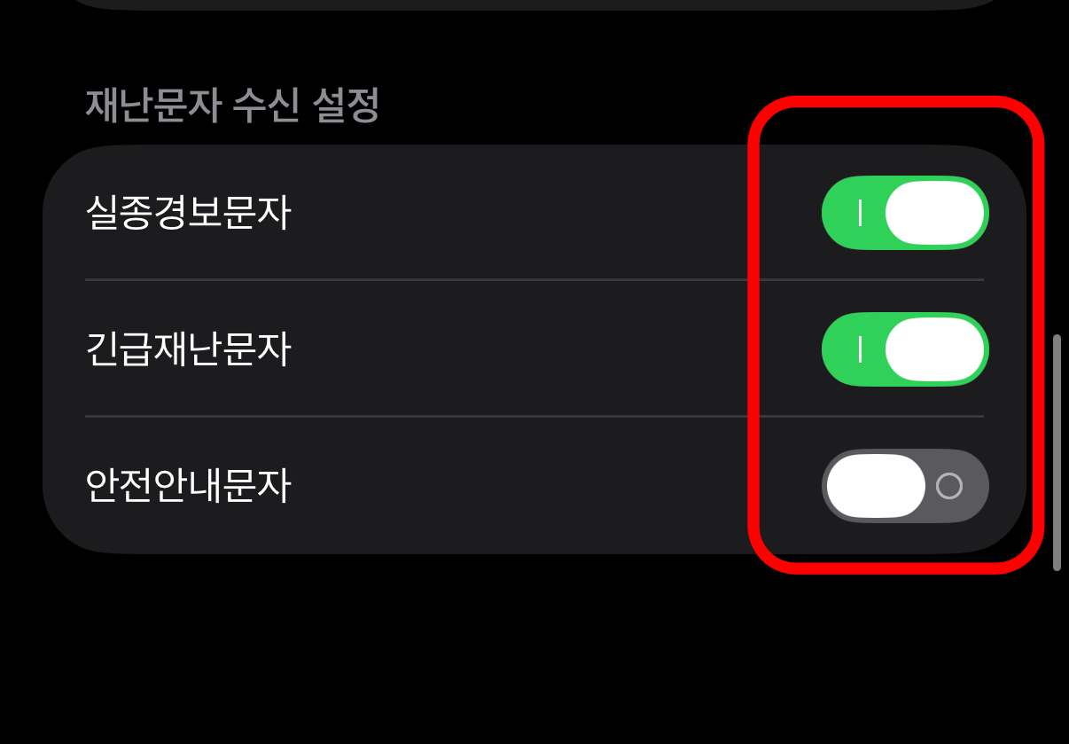 이러한 재난 문자들은 언제 어디서나 켰다, 껐다 설정이 가능하다.