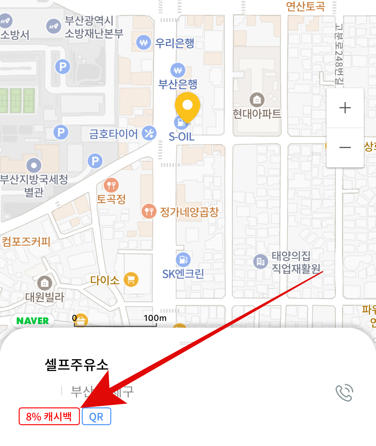 동백전에서 바로 기름값은 확인할 수 없다. 그래서 옆에 네이버지도나 카카오맵과 같은 주유소 기름값을 확인할 수 있는 어플을 켜놓자. 그리고 동백전에서 나오는 이름을 그대로 네이버지도에 입력하면 현재 기름값까지 확인할 수 있다. 현재 최저가의 기름값과 캐시백을 계산해서 부산 최저가 주유소를 찾을 수 있을 것이다.