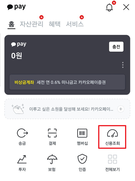 카카오톡에 메뉴창에서 카카오페이를 눌러주면 신용조회 카테고리로 들어온다면 한 눈에 내 신용점수를 확인할 수가 있다. 여기서 보여지는 내 신용점수는 카카오페이와 신용평가사인 코리아크레딧뷰가 제휴를 맺어 제공해주고 있는 것이며, 좀더 세세하게 파악하고 싶다면 앞서 언급한 어플을 이용해야한다.