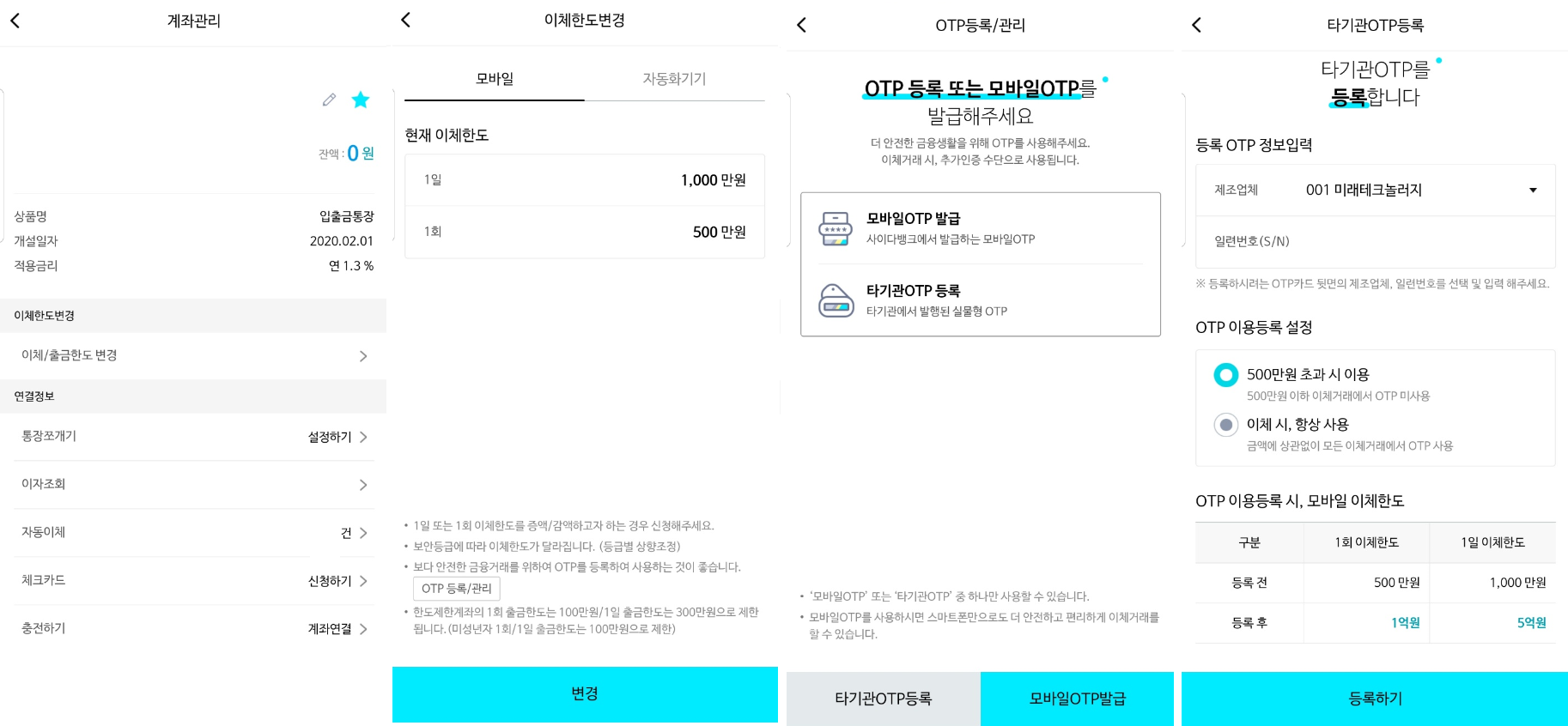 꼭 개인사업자가 아니더라도 파킹통장에서 목돈을 넣어두었다가 한 번에 빼야할 일이 있다면 OTP등록을 통해 1회 1억, 1일 5억의 한도로 사이다뱅크 파킹통장에서 이체한도를 늘리는 것중 가장 높이 늘리는 방법이다.