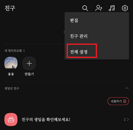 카카오톡 친구목록 창의 오른쪽 상단에 톱니바퀴 메뉴바를 눌러주면 편집, 친구 관리, 전체 설정이 있는데 전체설정 클릭!