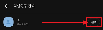 현재 차단등록 되어있는 인원들을 전부 볼 수가 있으며 이름옆쪽으로 관리탭이 보이는데 이것을 눌러 차단인원을 어떻게 관리할지를 설정할 수가 있게 된다.