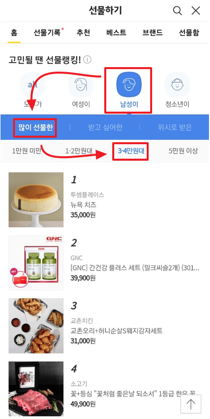 상대방이 위시리스트 목록에 원하는 물건을 담아두었다면 그중에 선택해서 보내주면 되겠지만 목록에 아무것도 담겨있지 않다면 아래쪽으로 내려오면 고민될 땐 선물 랭킹! 메뉴가 나오며 카카오톡 선물하기 기준으로 사람들이 많이 이용했던 순서로 상품을 볼 수가 있으니 선택의 폭이 좁혀져서 마음에 드는 선물을 할 수가 있을 것이다.
