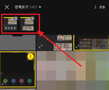꽉찬 화면에서 사진을 선택하게 되면 상단에 선택된 사진이 작게 표시가되며 선택한 순서대로 상대방에 전달이 되니 보내고싶은 사진의 순서대로 선택을 하면 되고 오른쪽 상단의 전송앞쪽으로 몇 장의 사진을 선택했는지 숫자로 파악을 할 수도 있다.
